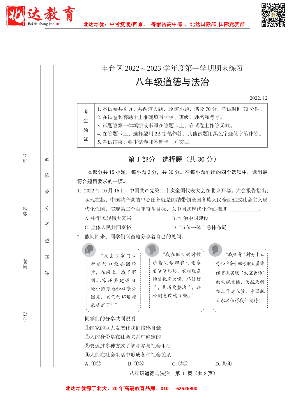 2022-2023学年北京丰台区初二上期末道法考试已结束,admw360中考网第一时间 为大家整理了相关试题及答案,分享给大家。