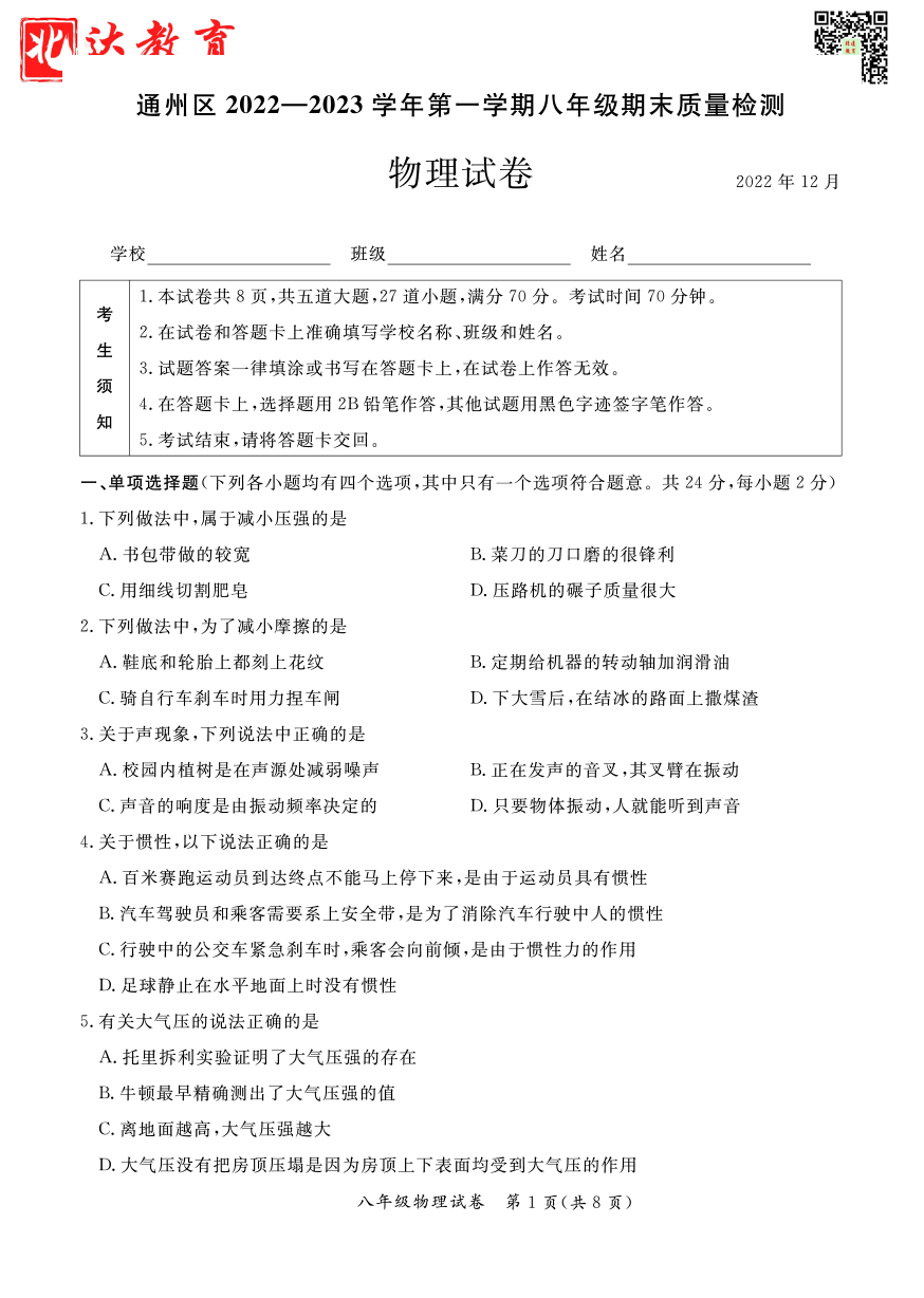 2022-2023学年北京通州区初二上期末物理考试已结束,admw360中考网第一时间 为大家整理了相关试题及答案,分享给大家。