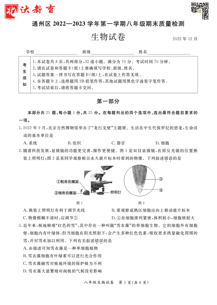 2022-2023学年北京通州区初二上期末生物考试已结束,admw360中考网第一时间 为大家整理了相关试题及答案,分享给大家。