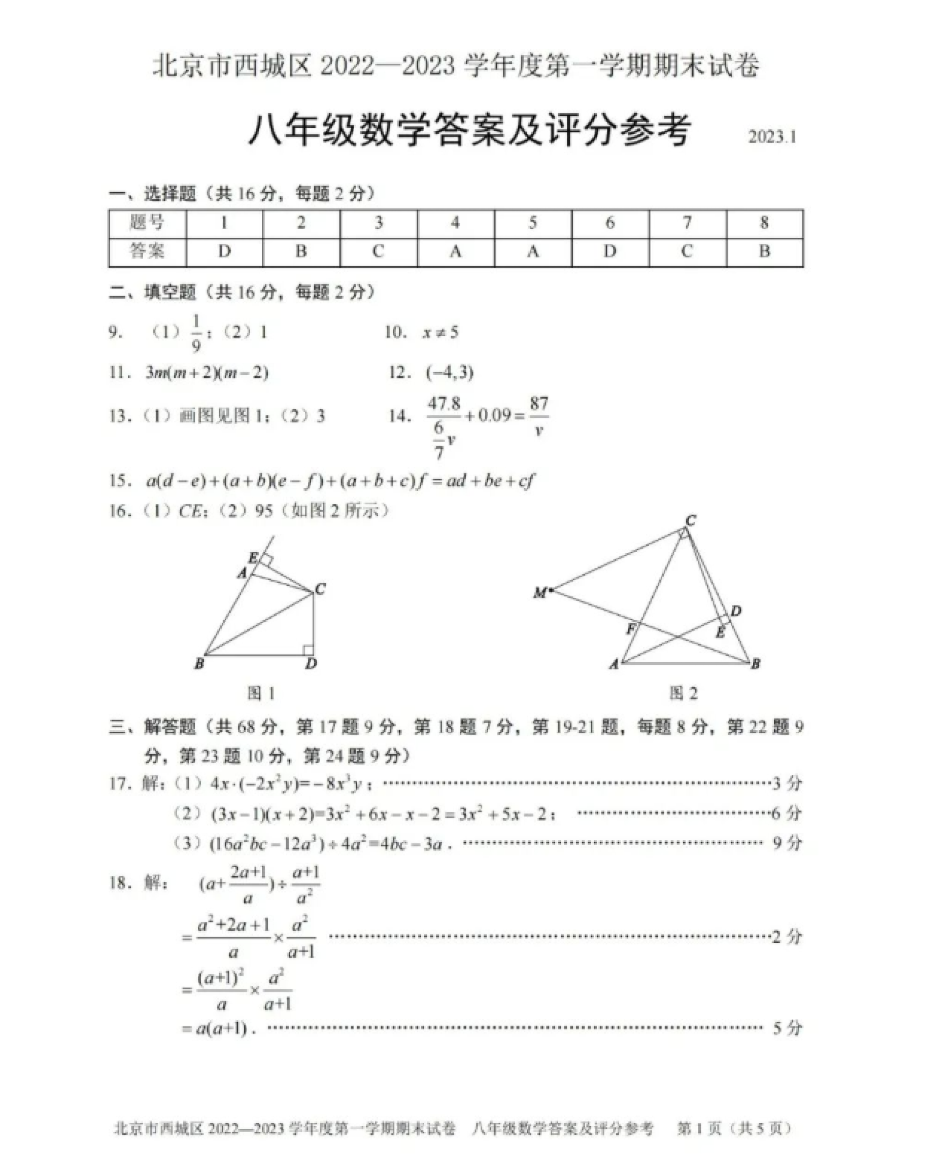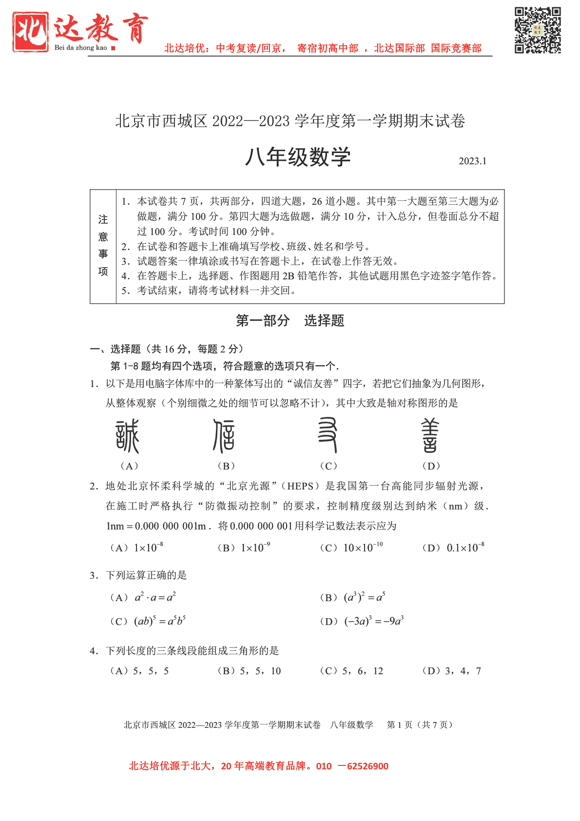 2022-2023学年北京西城区初二上期末数学考试已结束,admw360中考网第一时间 为大家整理了相关试题及答案,分享给大家。