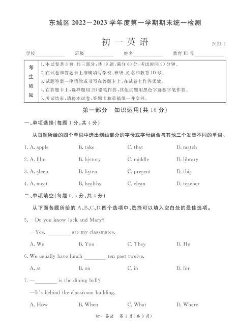 2022-2023学年北京东城区初一上期末英语考试已结束,admw360中考网第一时间 为大家整理了相关试题及答案,分享给大家。