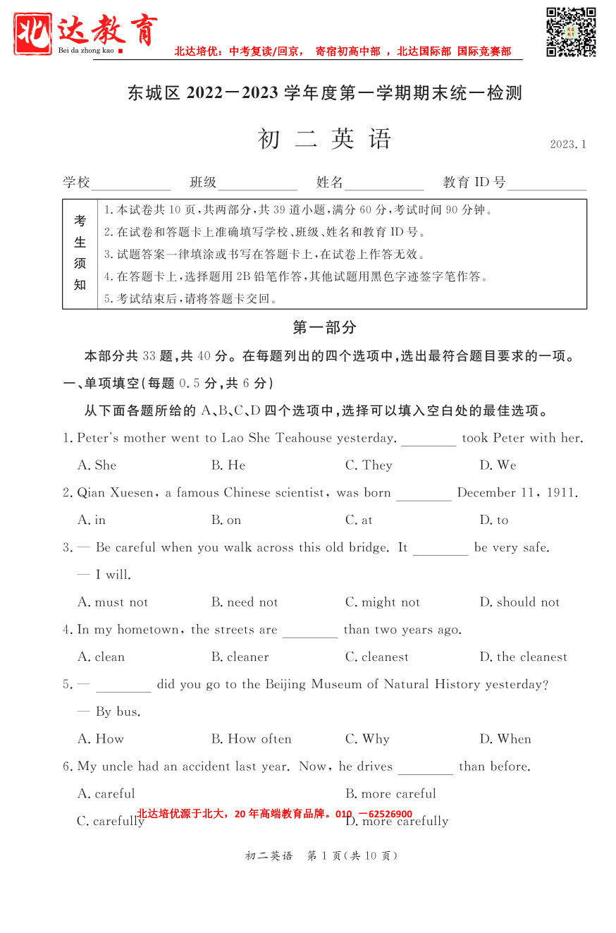 2022-2023学年北京东城区初二上期末英语考试已结束,admw360中考网第一时间 为大家整理了相关试题及答案,分享给大家。