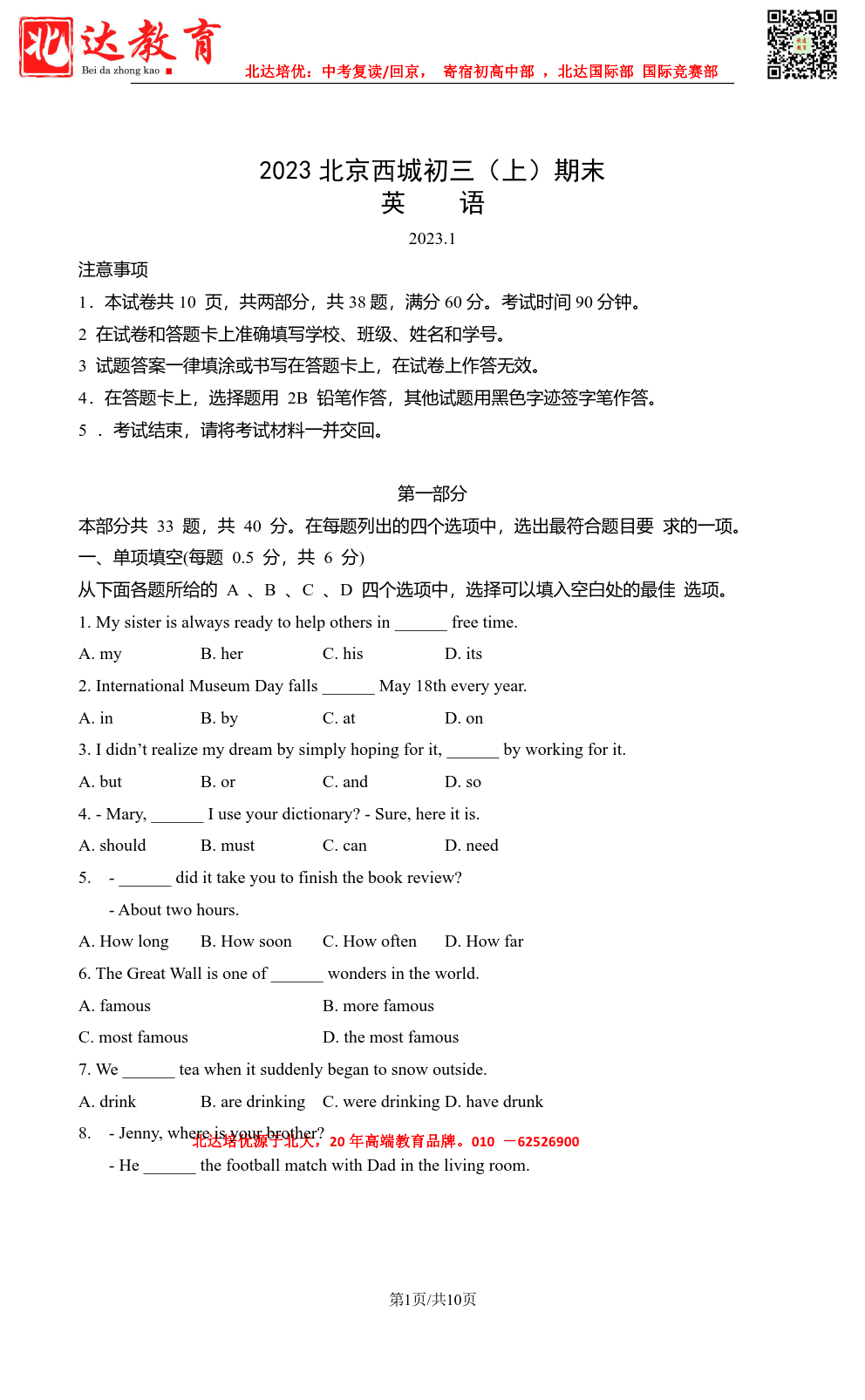 2022-2023学年北京西城区初三上期末英语考试已结束,admw360中考网第一时间 为大家整理了相关试题及答案,分享给大家。