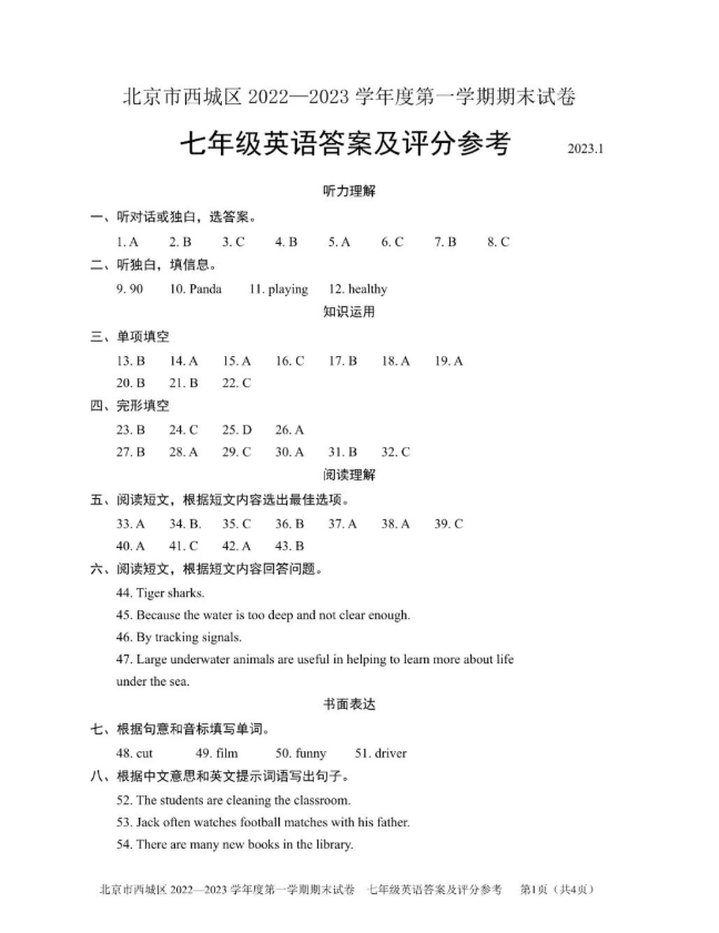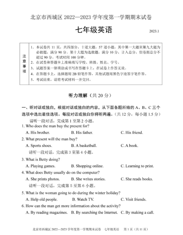 2022-2023学年北京西城区初一上期末英语考试已结束,admw360中考网第一时间 为大家整理了相关试题及答案,分享给大家。