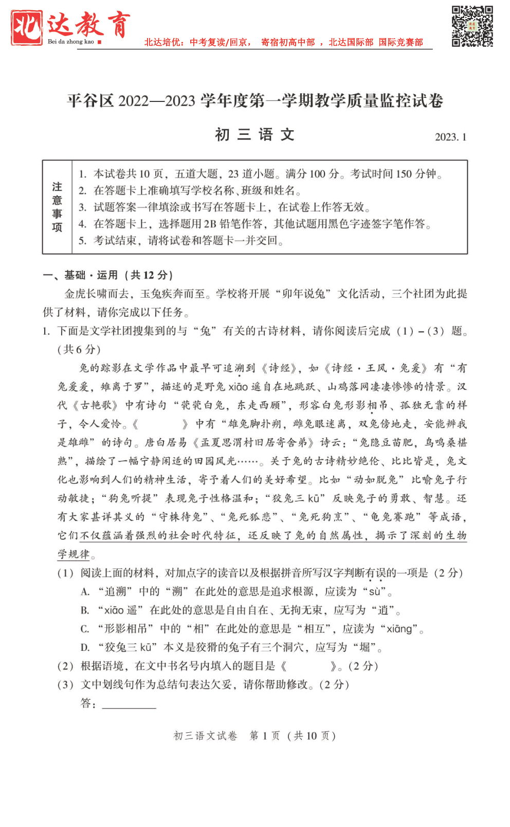 2022-2023学年北京平谷区初三上期末语文考试已结束,admw360中考网第一时间 为大家整理了相关试题及答案,分享给大家。