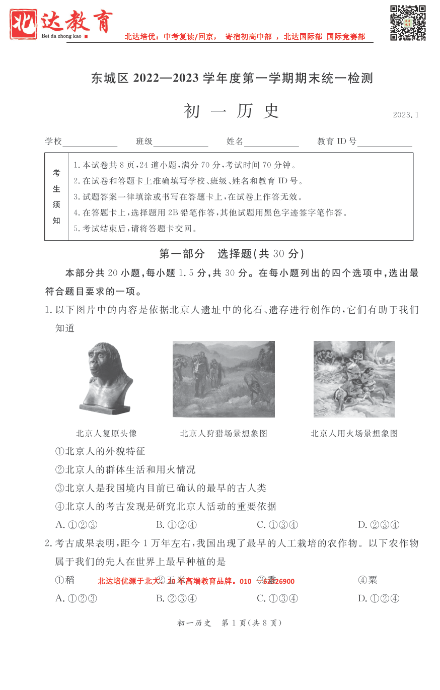 2022-2023学年北京东城区初一上期末历史考试已结束,admw360中考网第一时间 为大家整理了相关试题及答案,分享给大家。