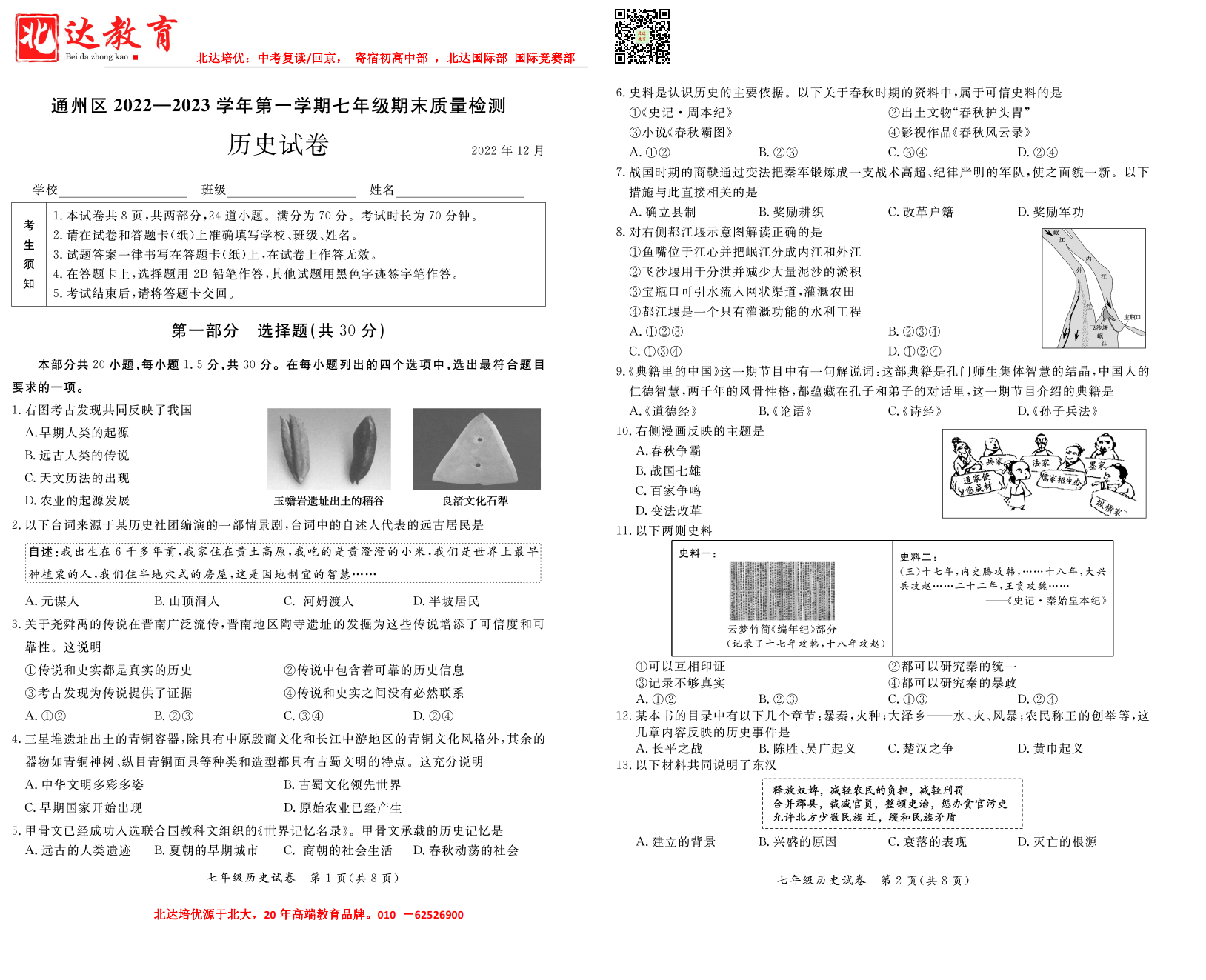 2022-2023学年北京通州区初一上期末历史考试已结束,admw360中考网第一时间 为大家整理了相关试题及答案,分享给大家。