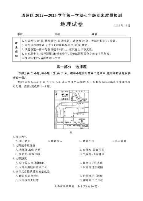 2022-2023学年北京通州区初一上期末地理试题及答案