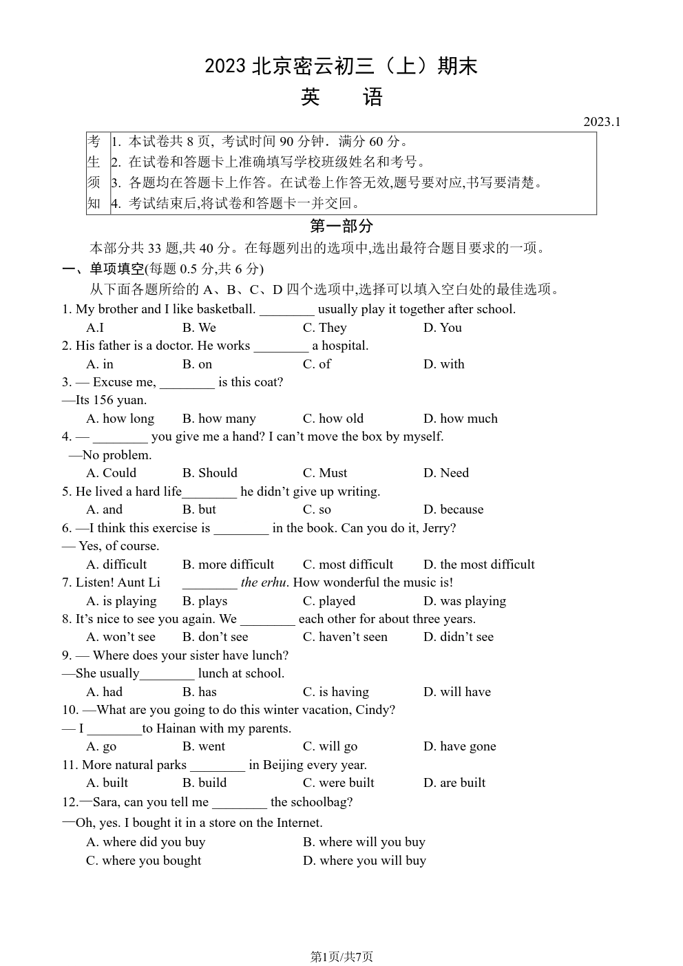 2022-2023学年北京密云区初三上期末英语考试已结束,admw360中考网第一时间 为大家整理了相关试题及答案,分享给大家。