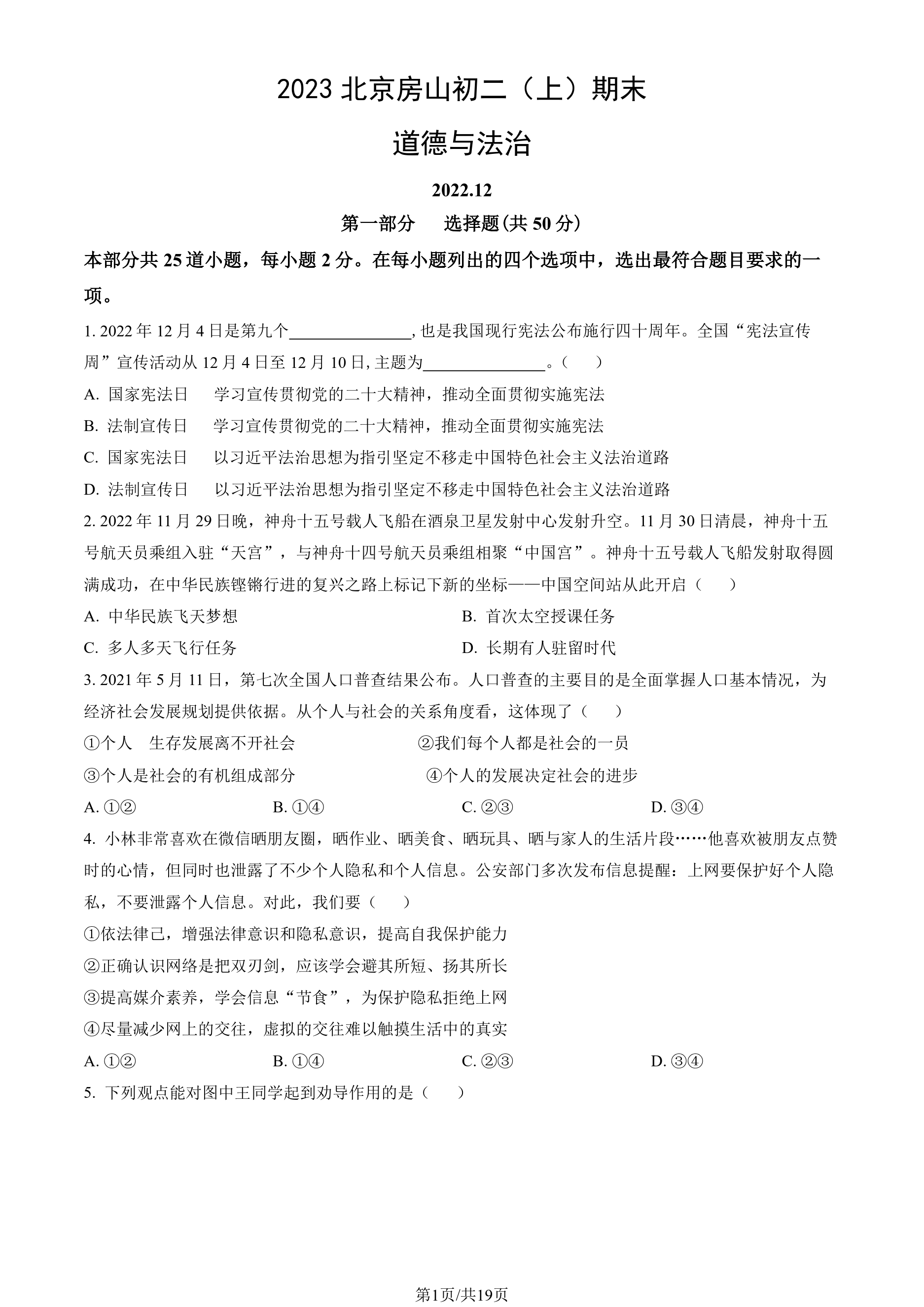 2022-2023学年北京房山区初二上期末道法考试已结束,admw360中考网第一时间 为大家整理了相关试题,分享给大家。