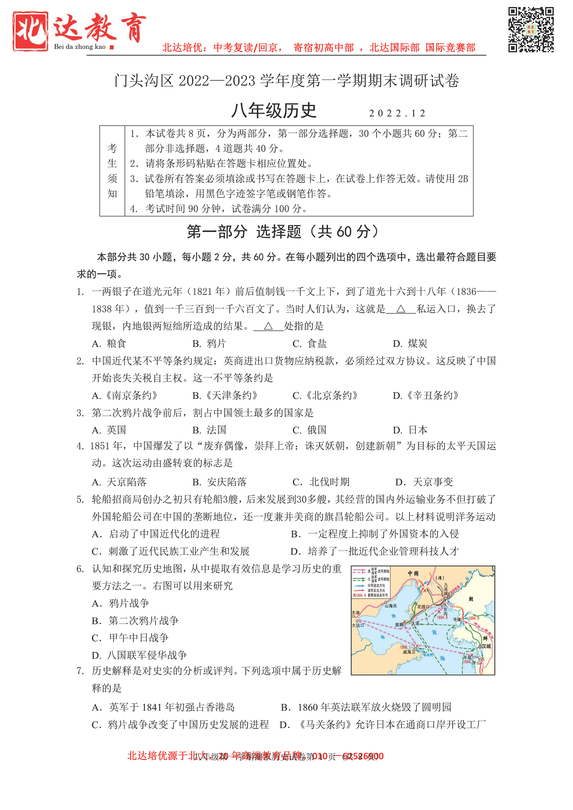 2022-2023学年北京门头沟区初二上期末历史考试已结束,admw360中考网第一时间 为大家整理了相关试题及答案,分享给大家。