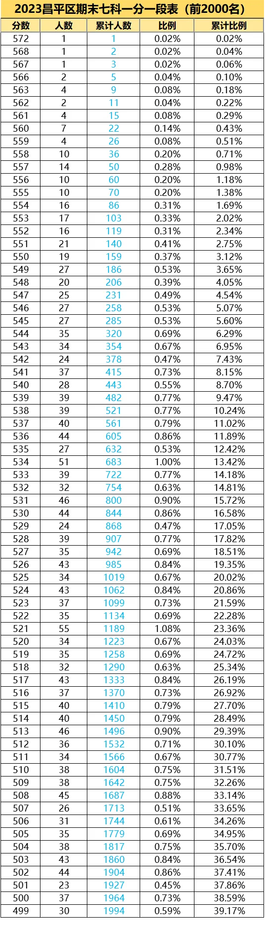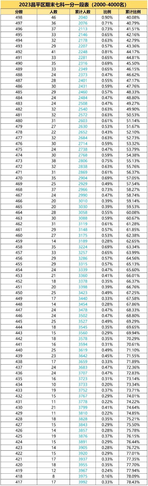 2023昌平初三期末(上)七科一分一段表(2000-4000名)网传版