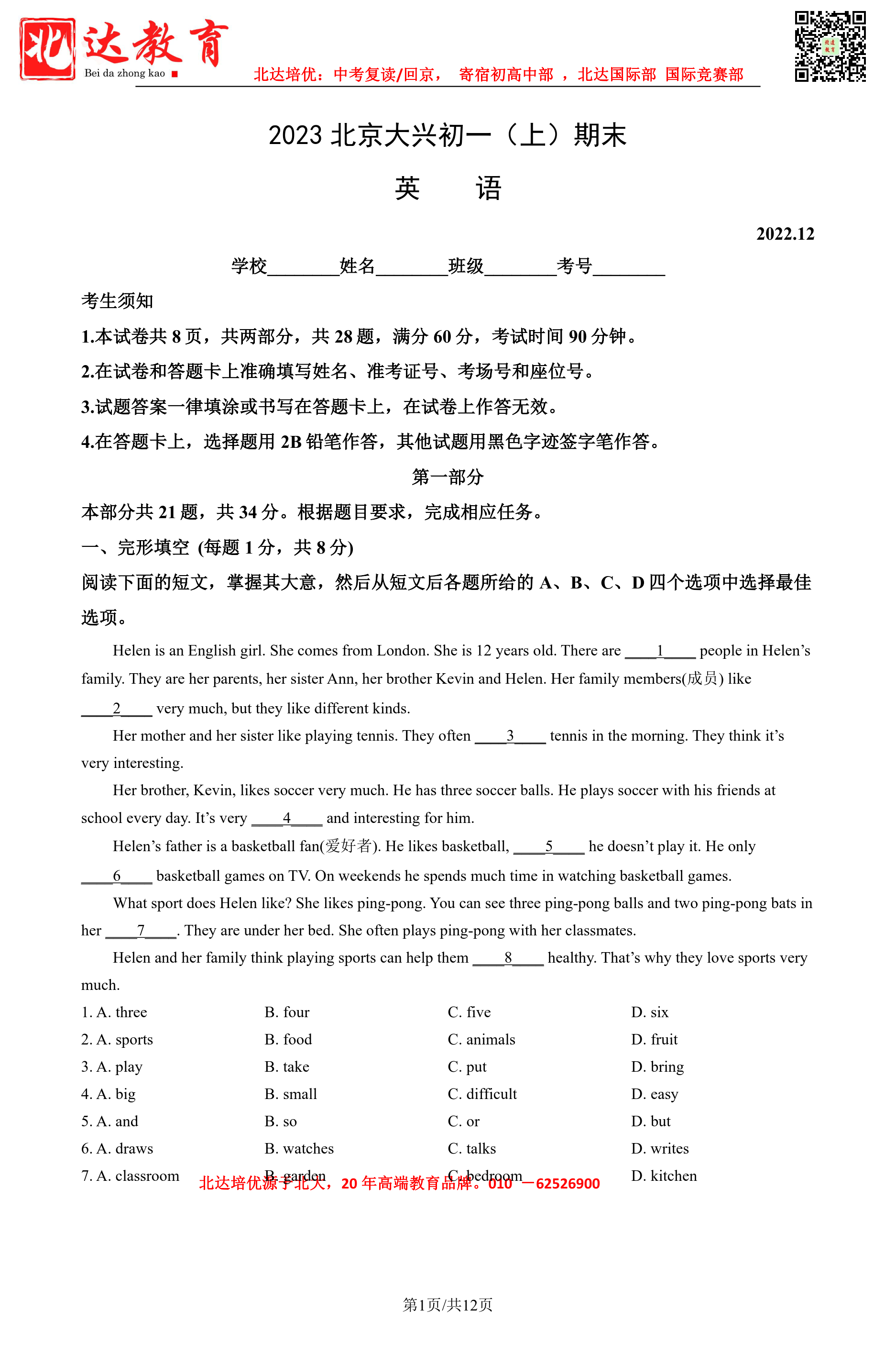 2022-2023学年北京大兴区初一上期末英语试题及答案