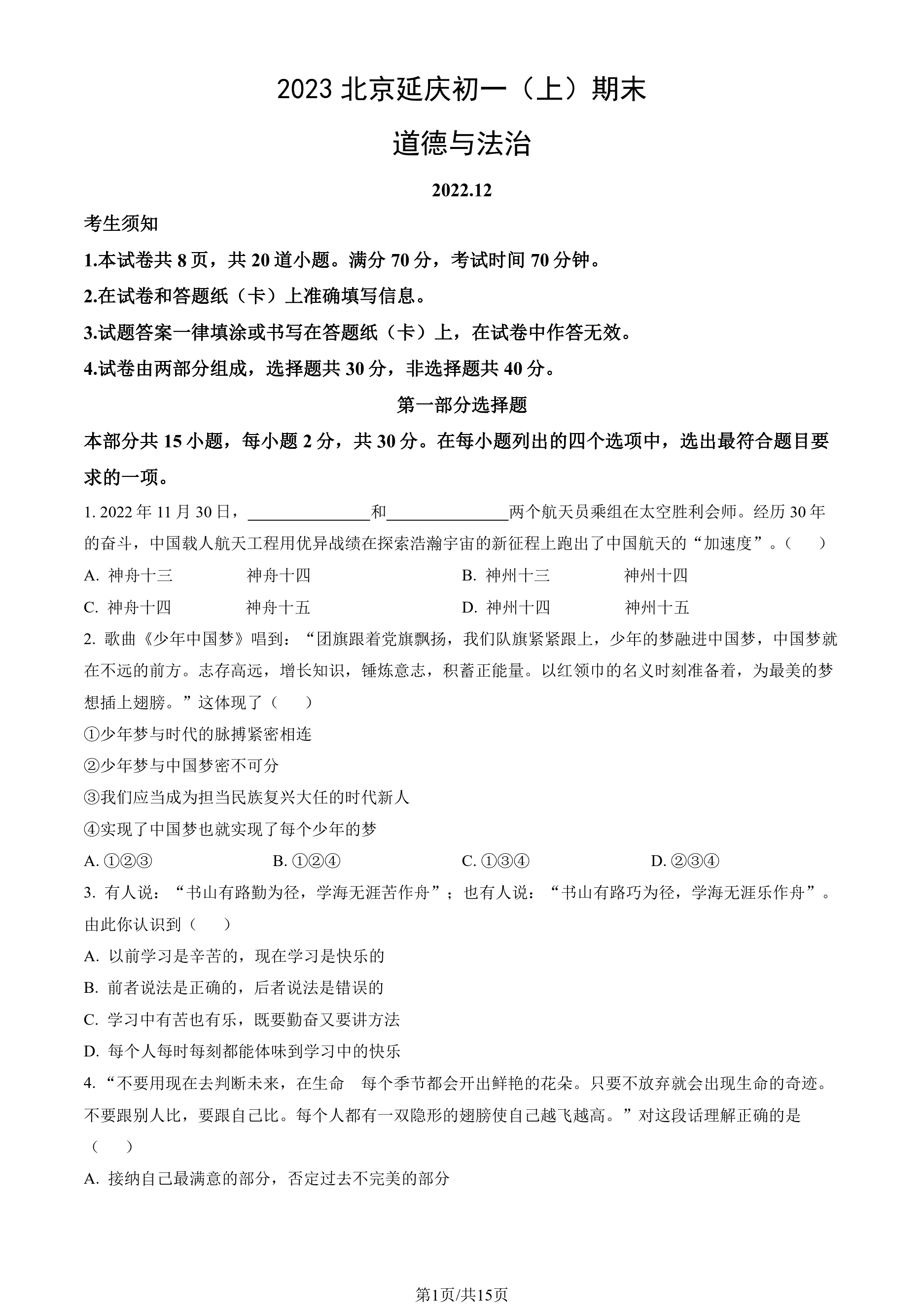 2022-2023学年北京延庆区初一上期末道法考试已结束,admw360中考网第一时间 为大家整理了相关试题及答案,分享给大家。
