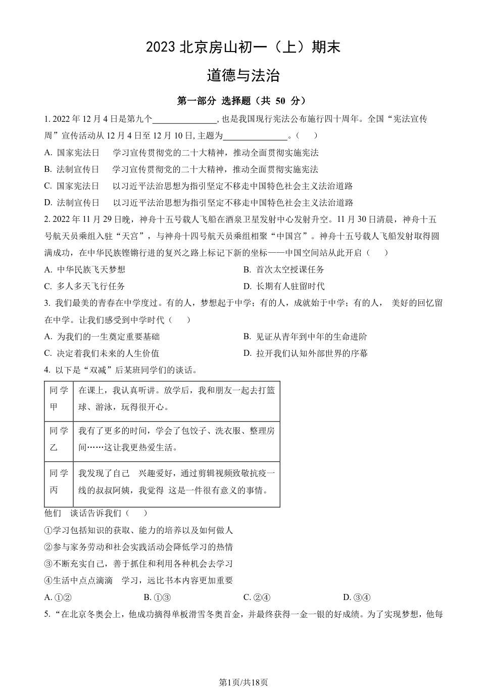2022-2023学年北京房山区初一上期末道法考试已结束,admw360中考网第一时间 为大家整理了相关试题及答案,分享给大家。