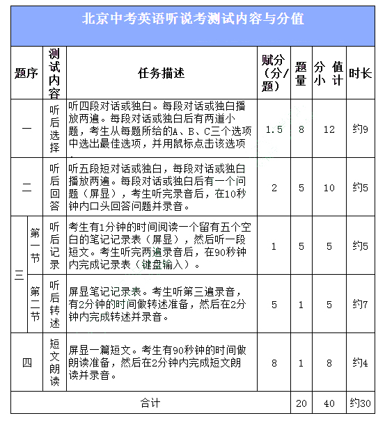 2023北京初中学考英语听说考共有四大题,分为5类题型,分别是听后选择12分、听后回答10分、听后记录信息5分、听后转述5分和朗读短文8分。,各个题型都有不一样的答题方式,给大家分享,仅供参考哦~