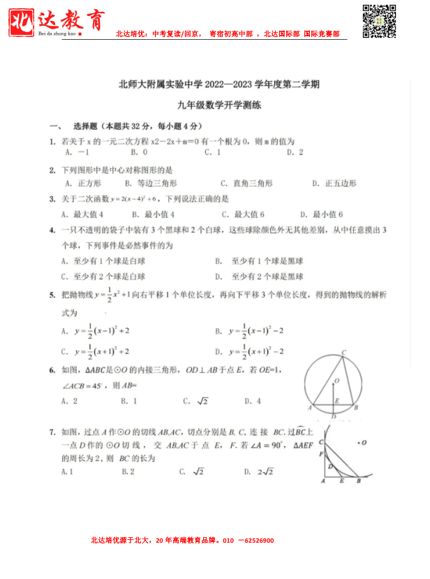 2022-2023学年北师大附属实验中学初三下数学开学测试题