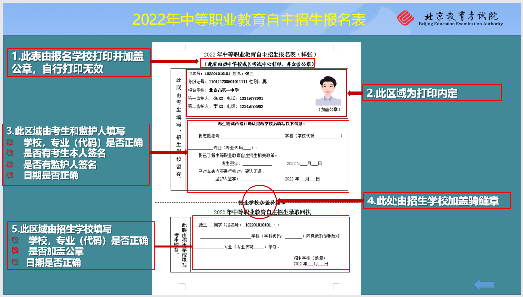 考生在中职自主招生报考时间内,按照招生学校规定时间和要求携带“2022年中等职业教育自主招生报名表”和“2022年北京市高级中等学校招生体格检查表”参加招生学校组织的专业能力测试。