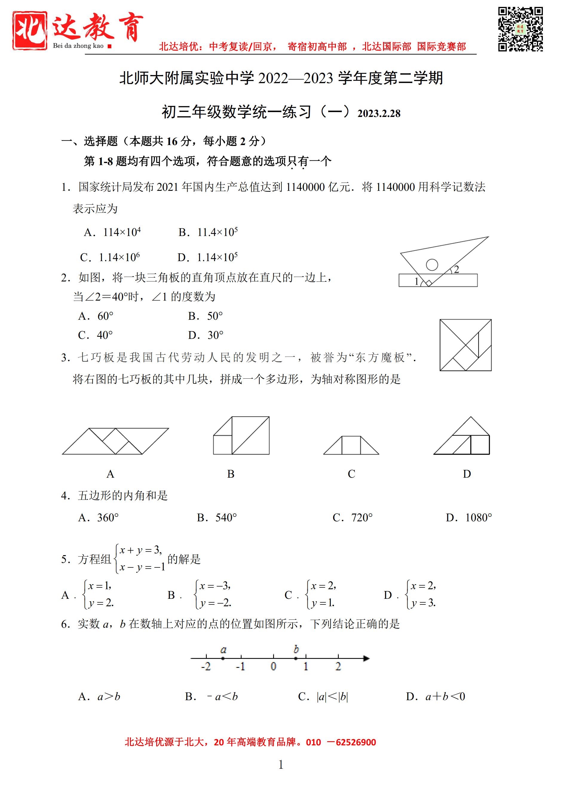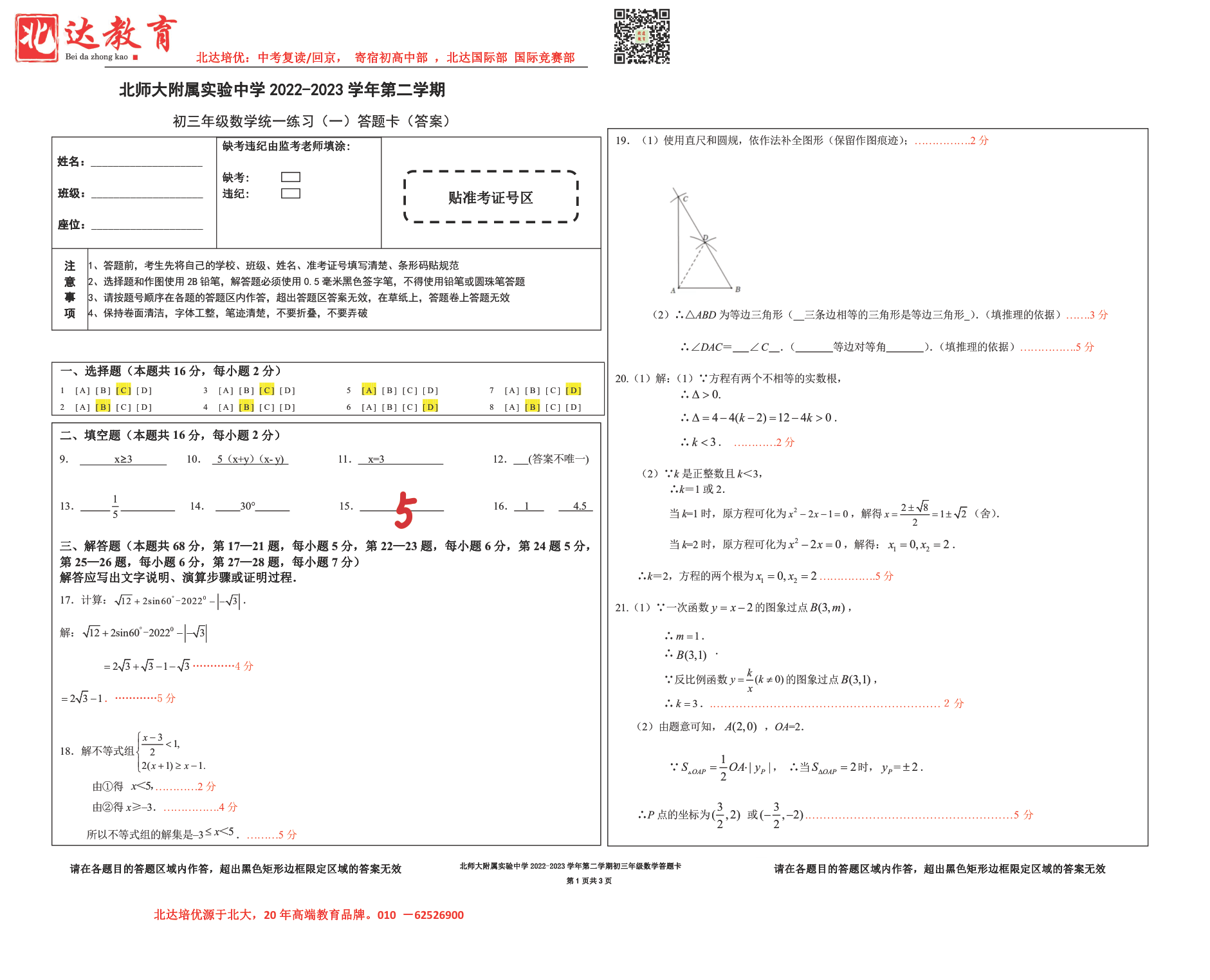 admw360中考网为大家整理了2022-2023学年北师大实验中学九年级下数学统一练习(一) 试题及答案,分享给大家。