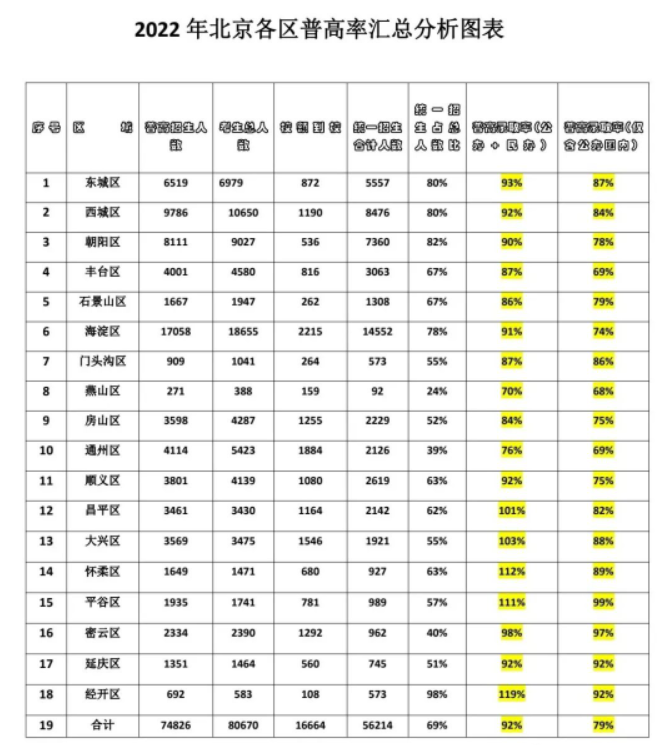 不过郊区的普高率还是普遍较高,大家可以换个方向思考,你可以城区受教育,如果学不出来,中考移民到普高率的郊区,不就是那边的学霸了么?但是你只能在远郊区上高中,城区高中在郊区招生的名额十分有限,这样上了高中在准备考大学,那么教育水平落后的郊区就不如海淀等城区了。