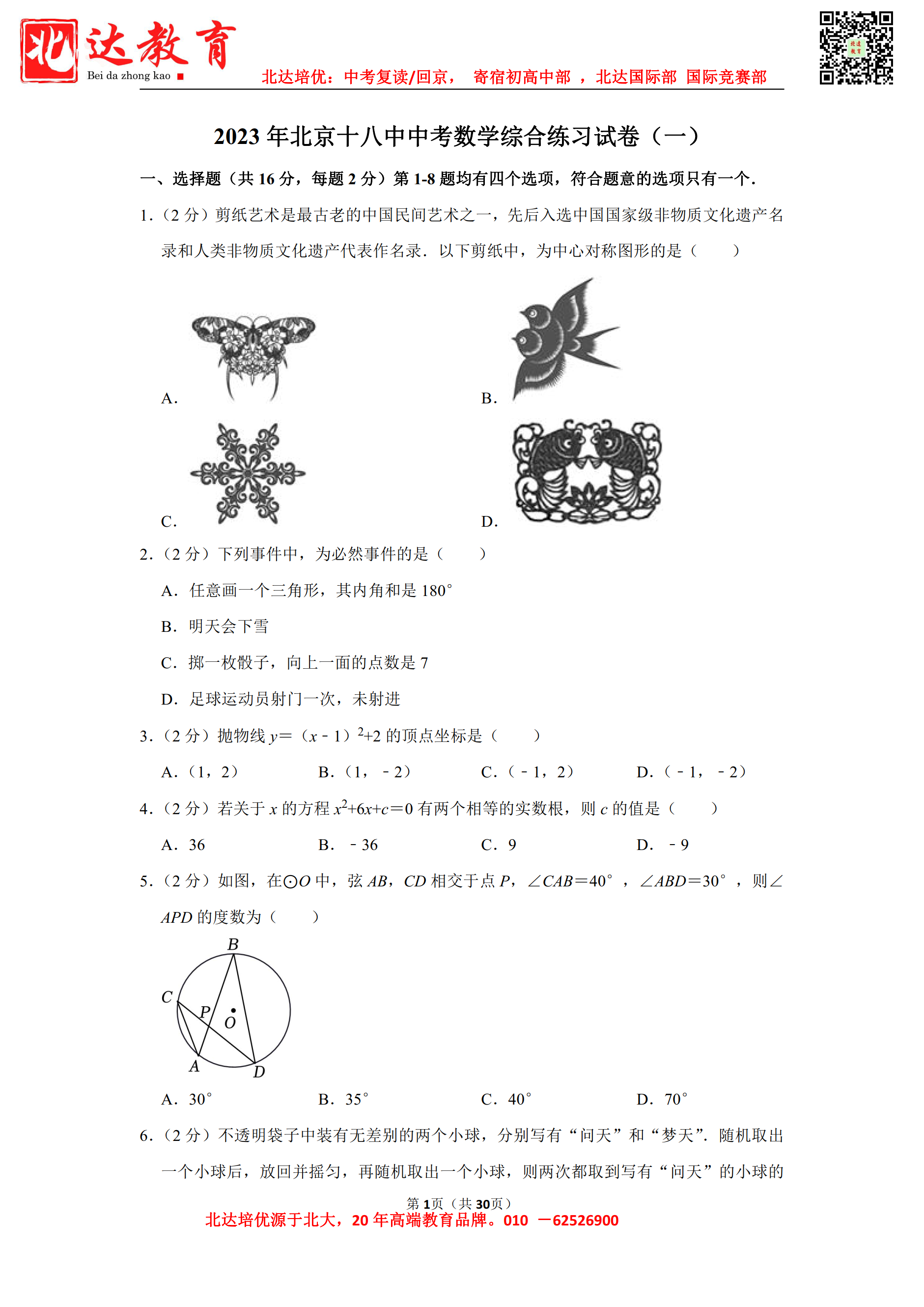 admw360中考网整理了2023年北京十八中中考数学综合练习试卷(一),分享给大家,考生和家长可自行下载!