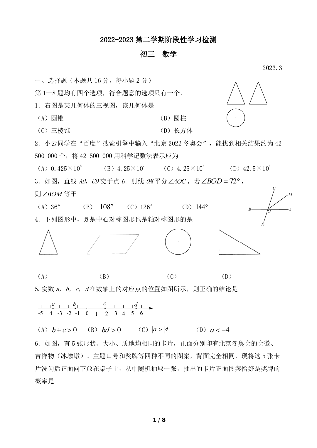 2022-2023学年北京各区初三上期末试卷&答案汇总