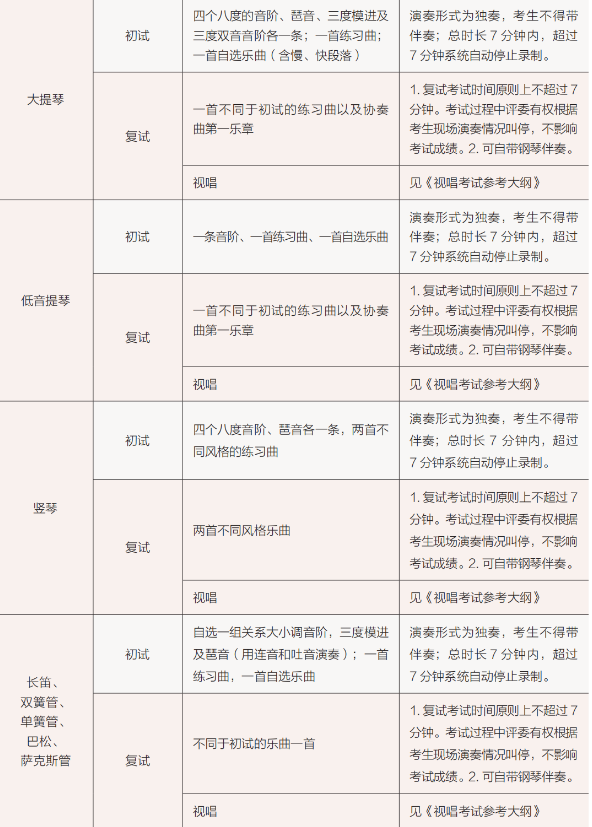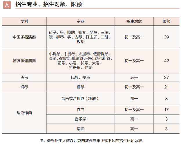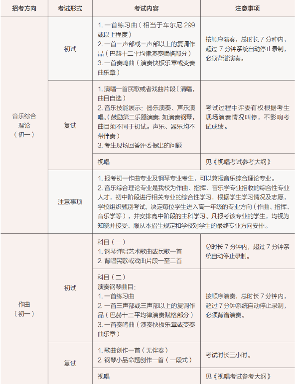 B 类:初一年级:作曲专业、音乐综合理论专业、钢琴专业、管弦乐器演奏(弦乐)专业:C 类: 高一年级:中国乐器演奏专业、音乐学专业、管弦乐器演奏(管乐、竖琴、西洋打击乐)专业;D 类: 高一年级: 作曲专业、指挥专业、钢琴专业、管弦乐器演奏(弦乐)专业。