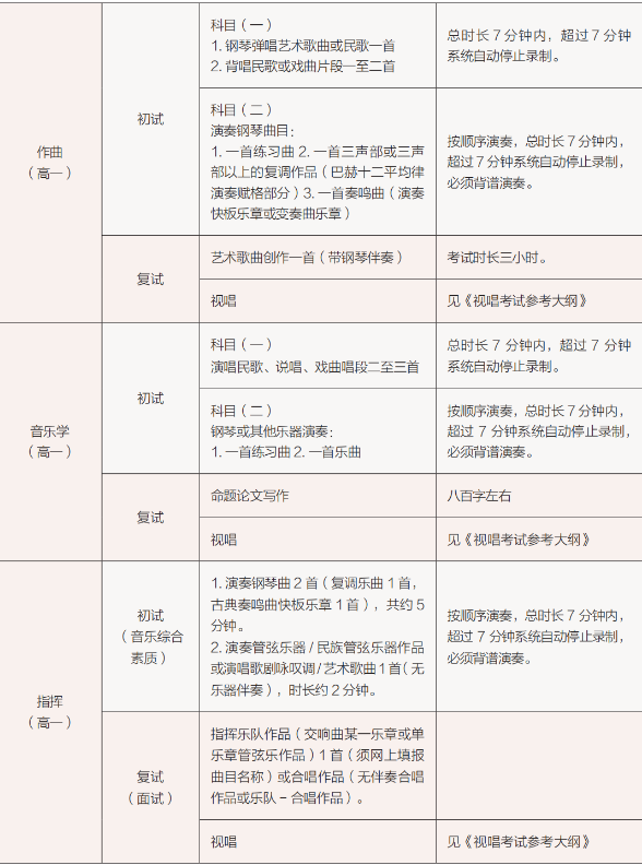 以下四类专业:作曲专业、音乐综合理论专业、音乐学专业、指挥专业,考试内容为视唱新谱;其余表演专业,考试内容为视唱新谱与指定视唱乐谱。指定视唱乐谱(将于考试日期前 3 天在中国音乐学院附中官网发布)。