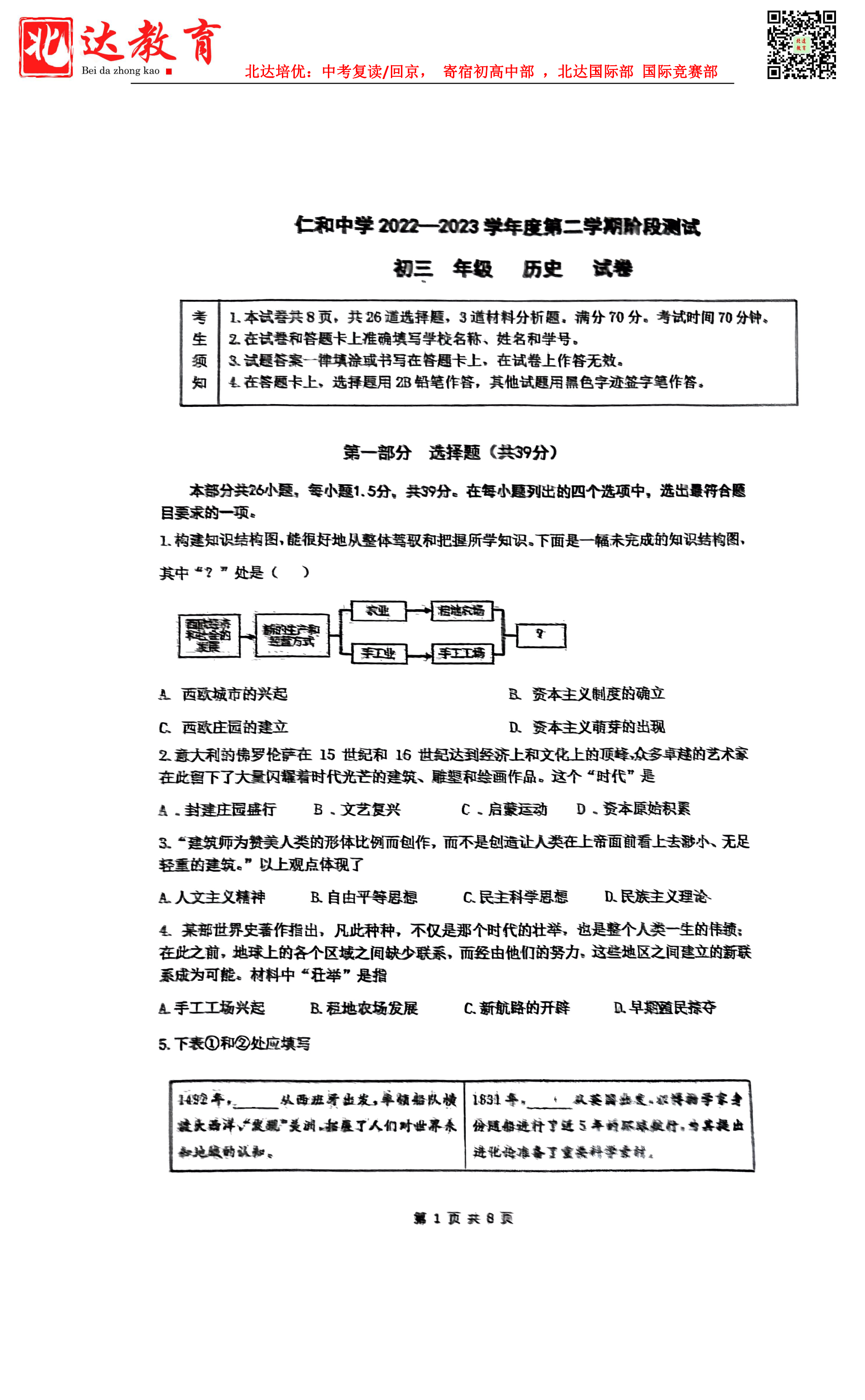 admw360中考网整理了2022-2023学年北京市顺义区仁和中学九年级下l历史3月考试卷,分享给大家。需要的同学赶紧下载练习起来吧。