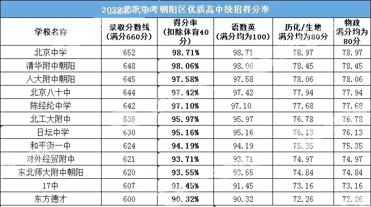 朝阳区今年比较冒尖的是北京中学,想去这所学校,得分最少得652分,得分率不能低于98.71%,语数英平均分需要98.71分。其他学校如图所示