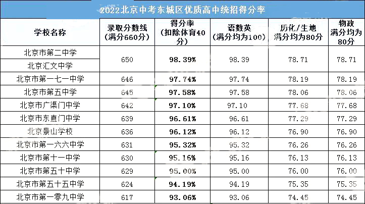 从东城区这个表来看,如果孩子想去东城二中,最多扣分也是不能超过10分,得分率得到98.39%,语语数英平均分得到98.39分。这个分数是最低分,最低也不能低于这个分数。其他学校情况如图所示
