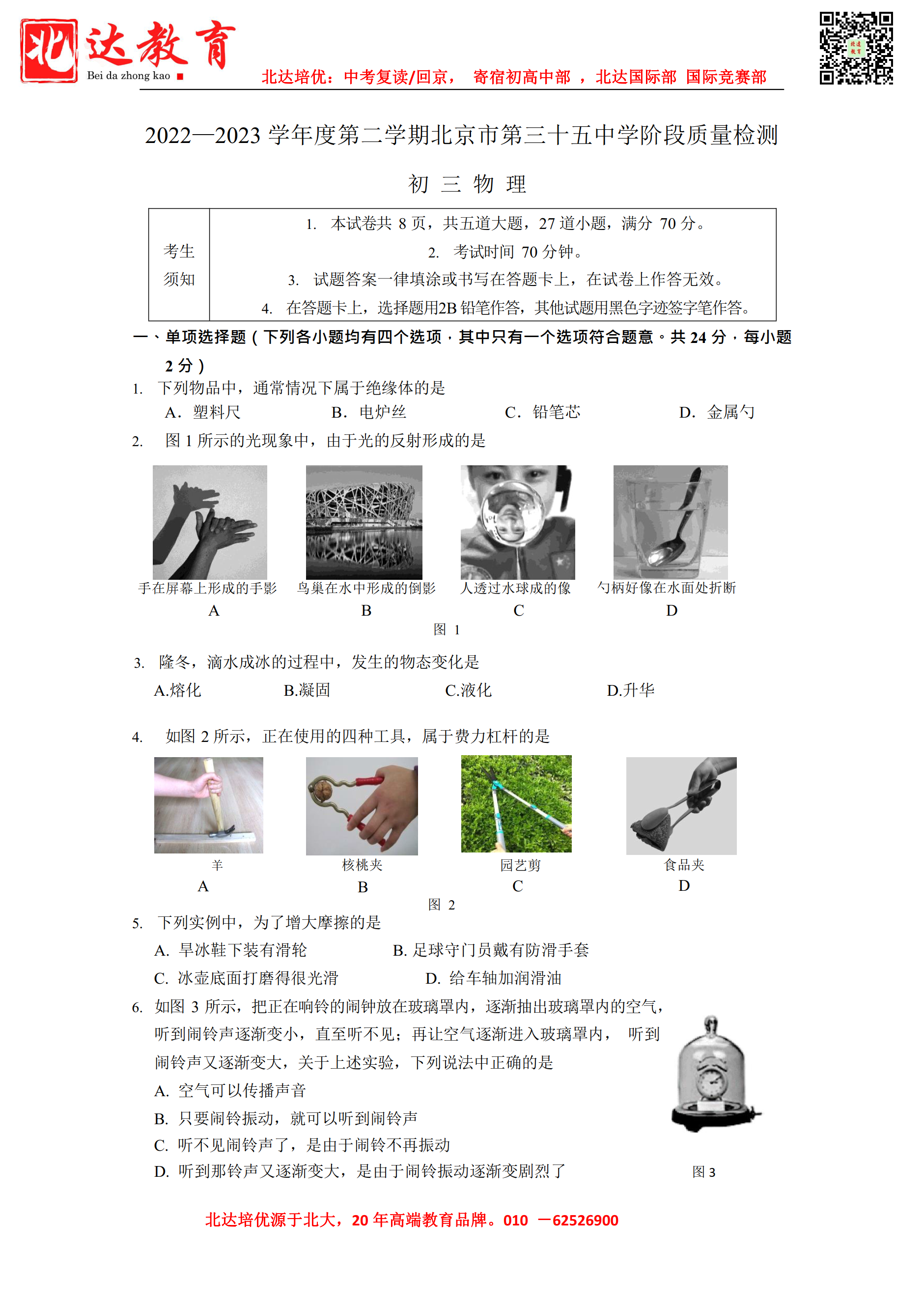admw360中考网整理了2022-2023学年北京第三十五中学九年级下3月月考物理试题,分享给大家。需要的同学赶紧下载练习起来吧。