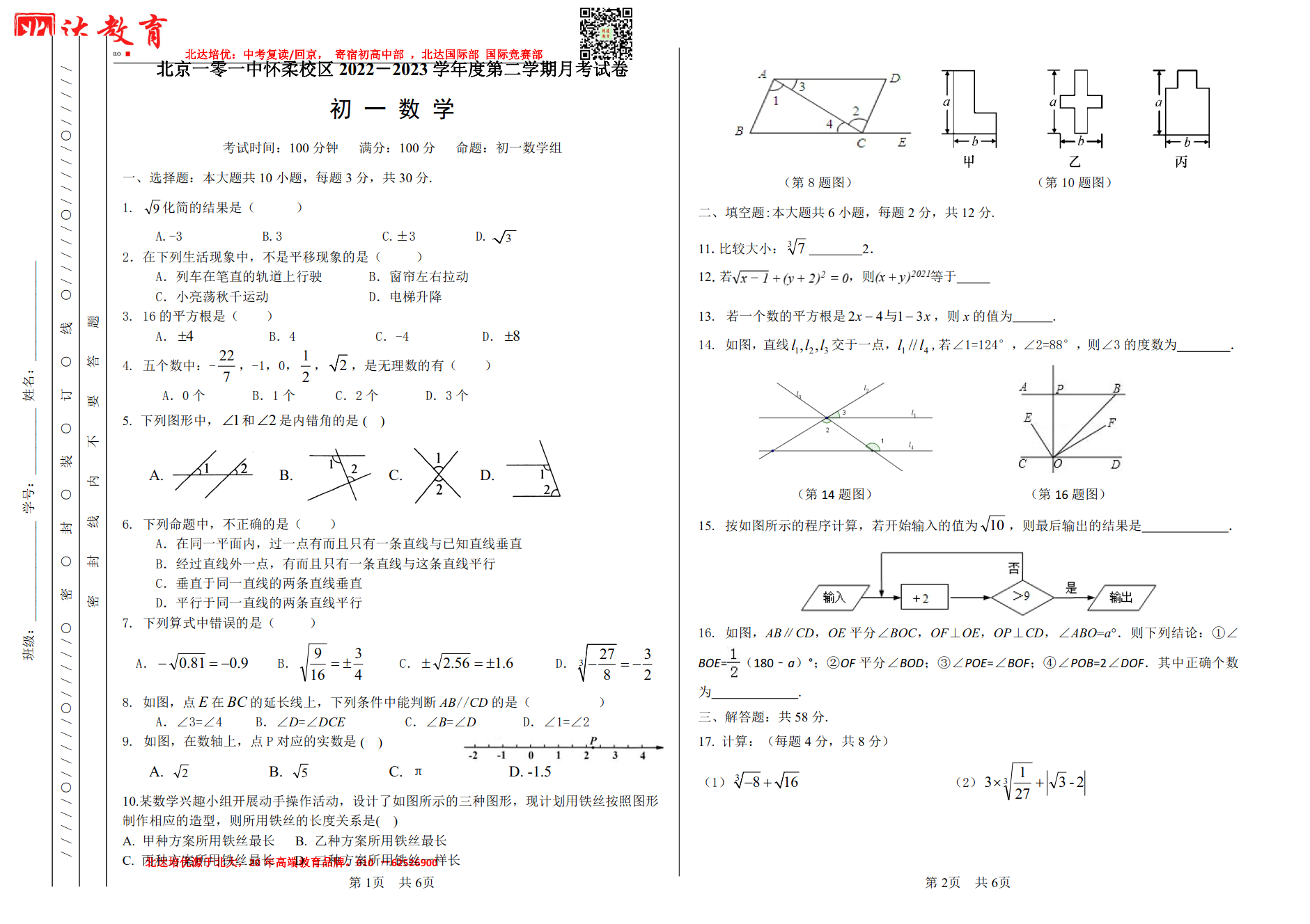 3月,北京各中学初一年级陆续组织月考,月考试题可作日常练习使用!admw360中考网为大家搜集整理了2022~2023学年一零一中学怀柔分校初一下数学3月考试卷,仅供考生下载练习!