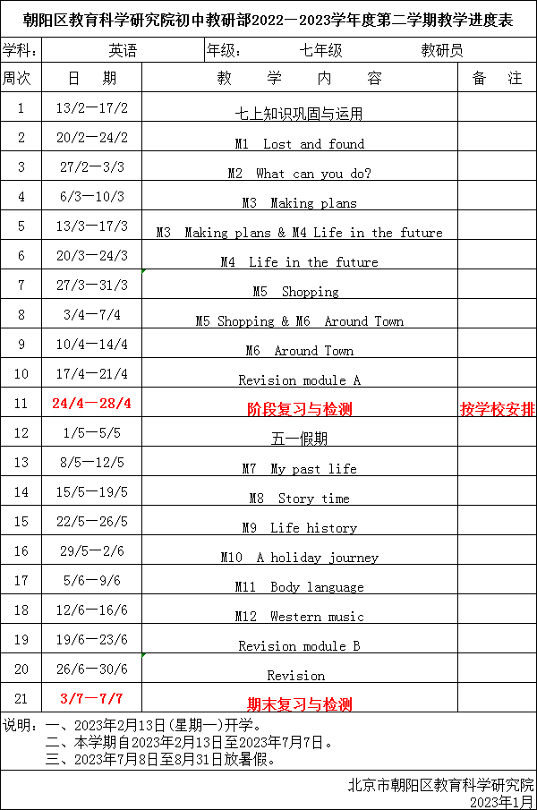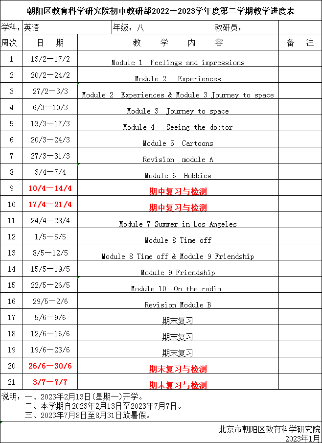 根据朝阳区教育研究中心公布的《初中2022-2023学年度第二学期进度表》来看,朝阳区初中各年级期中期末安排如下: