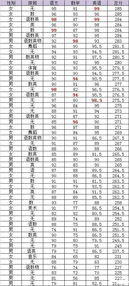 水木家长:上周整个学校进行了月考,这是分数汇总(全班52人)