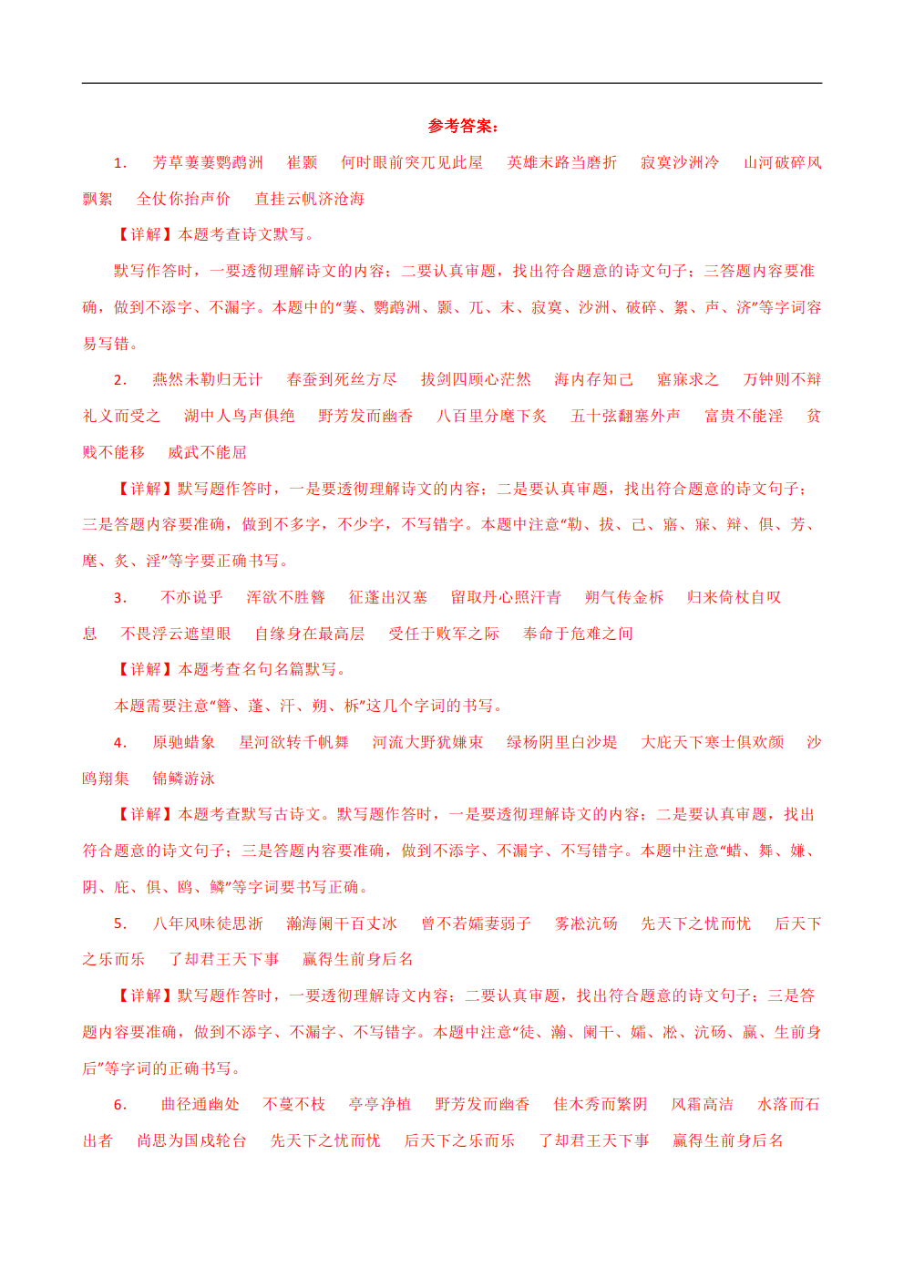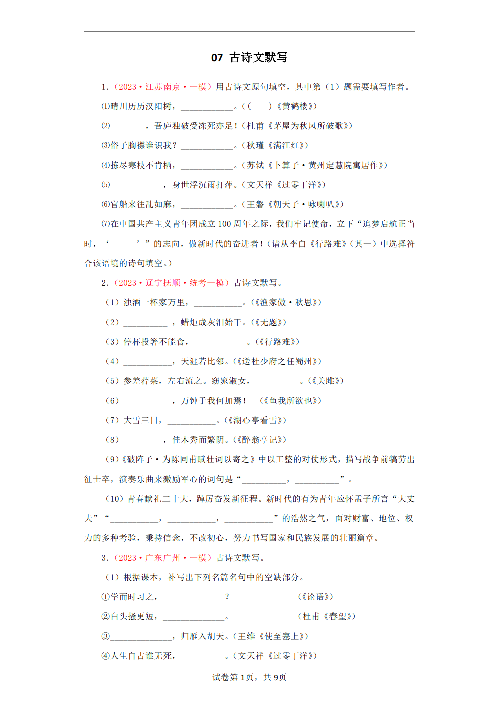 07古诗文默写一 2023年中考语文一模试题分项汇编(全国通用)