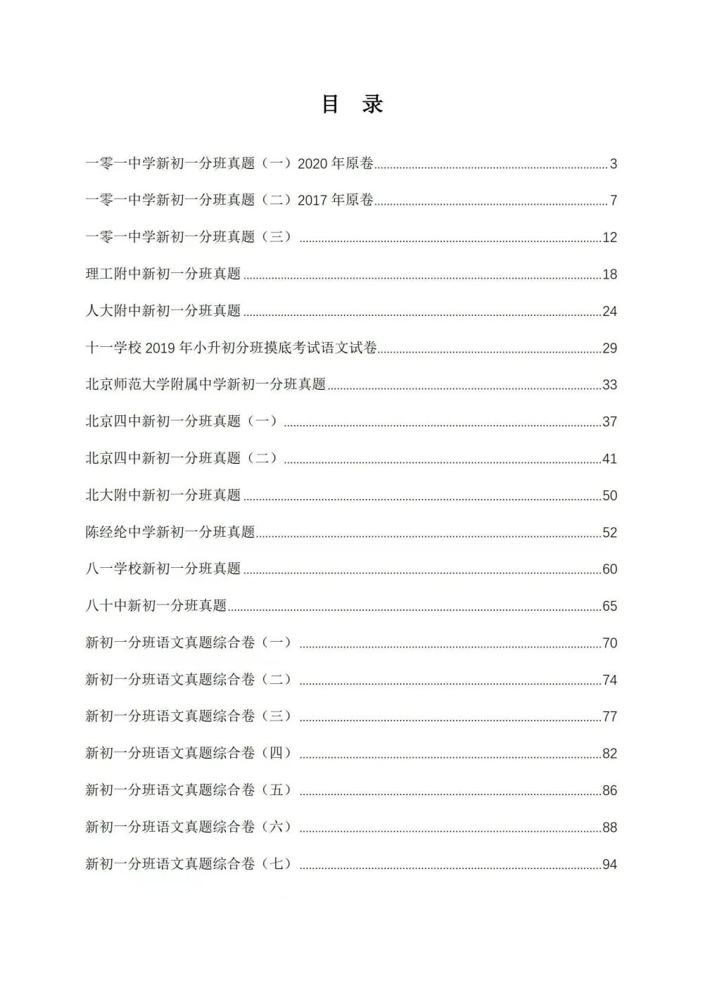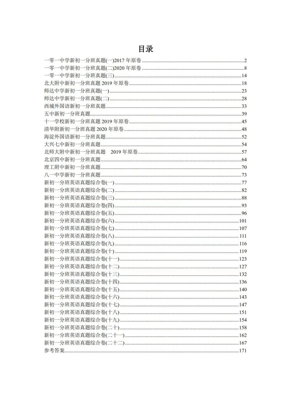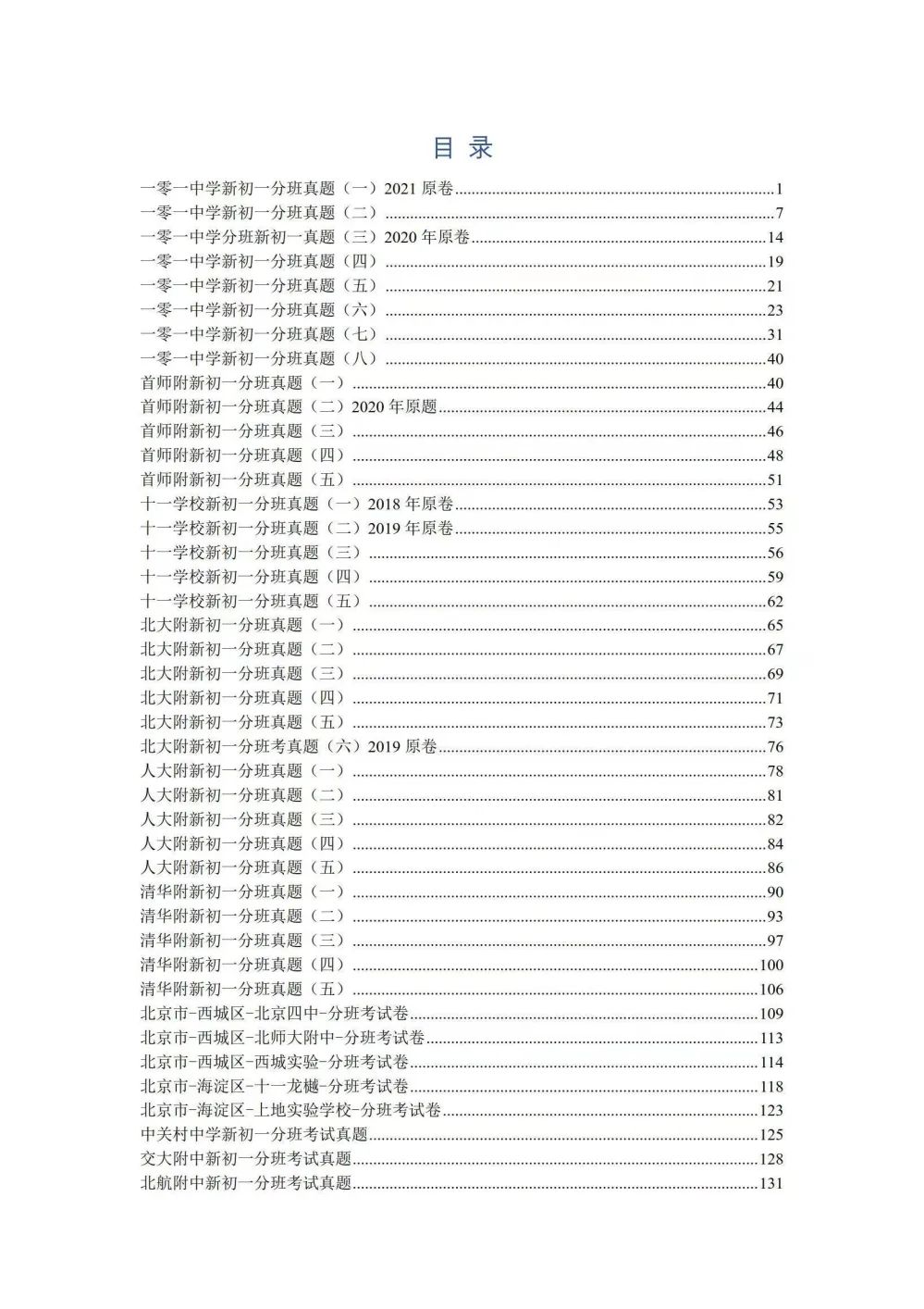 2023届参考!2022届小升初分班考时间~附新初一分班真题 beidaliu 2023年4月20日 10:08 阅读(10606) 评论关闭 2022届小升初的分班考试,以下时间仅供参考,大家提前为孩子做好准备!并附新初一分班真题练习题册(语数英)。 2022届xsc分班考时间 1.清华附,7月16日 2.清上,7月16… 2022届小升初的分班考试,以下时间仅供参考,大家提前为孩子做好准备!并附新初一分班真题练习题册(语数英)。 2022届xsc分班考时间 1.清华附,7月16日 2.清上,7月16日 3.师达,7月10日 4.八一,7月18日 5.人分,7.9领通知书 6.人本,7.10领通知书 7.101,7月9日 8.上地实验,7月9日 9.北大附中,7月9日 10.一零一温泉,7月9日 11.一零一矿大,7月18日 12.十一龙樾,7月9日 13.十一本校,7月9日 14.十一北校区,7月9日 15.十一晋元,7月9日 16.一零一石油,7月9日 17.一零一双榆树,7月9日 18.57中,7月19日 19.20中,7月9日 20.人翠,7月18号 21.玉渊潭,7月18号 21.西城13分7.18号分班考试 22.西城161中学7.15分班考 以上时间仅供参考,大家提前为孩子做好准备! 2023北京新初一分班真题练习题册(语数英) 涵盖清华附、十一学校、一零一中学等多所市重点、民办校、优质普校、区重点学校分班真题原卷,附参考答案。需要的同学可扫码咨询购买。 试题预览: 标签:北京小升初