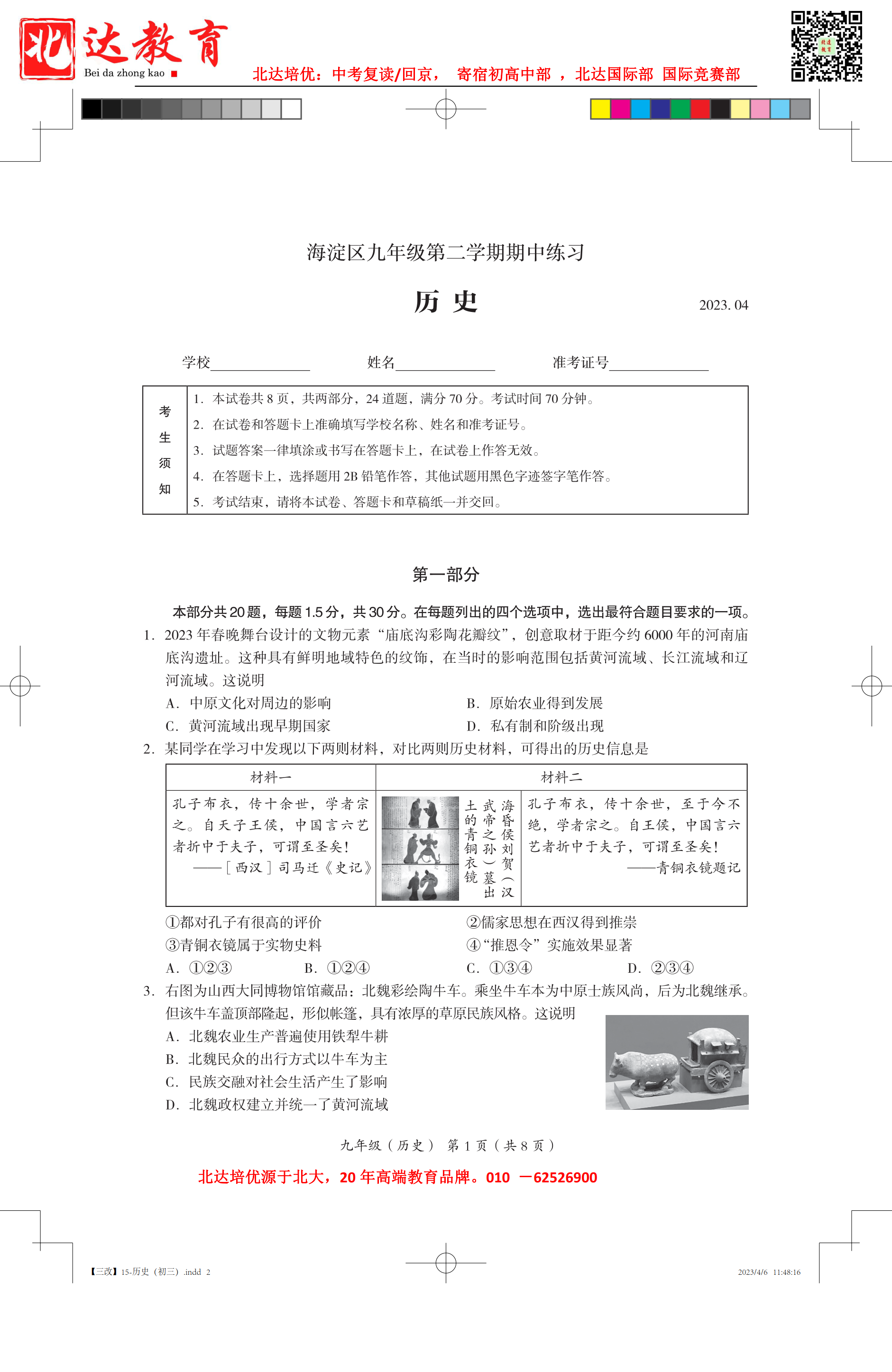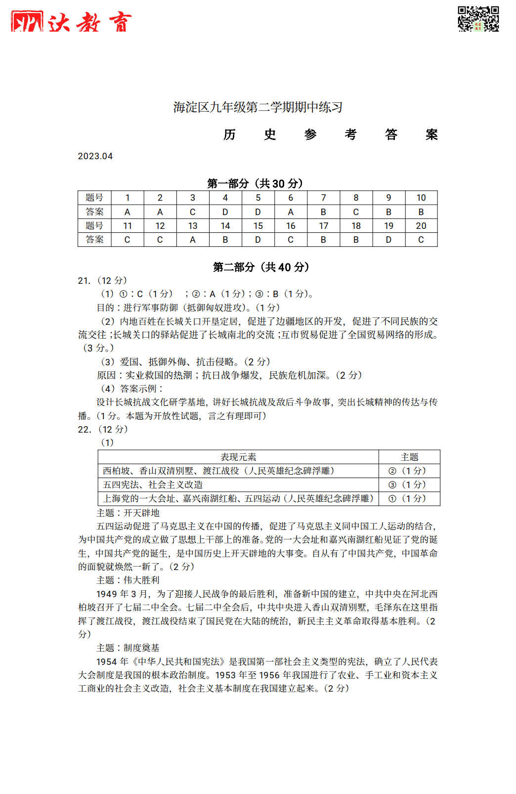 admw360中考网第一时间为大家整理了2023北京海淀区初三一模历史试题及答案,分享给大家。