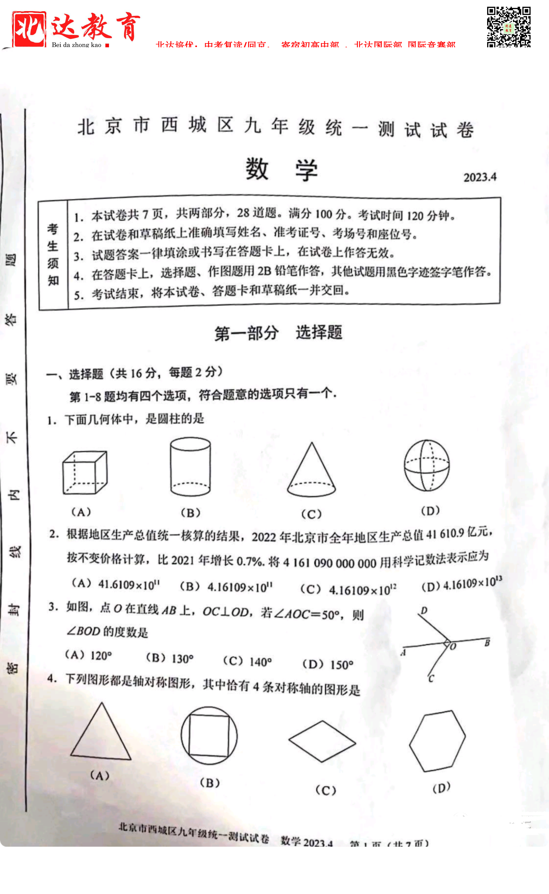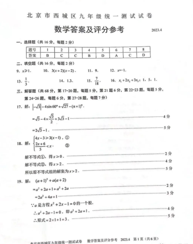 admw360中考网第一时间为大家整理了2023北京西城区初三一模数学试题及答案,分享给大家。