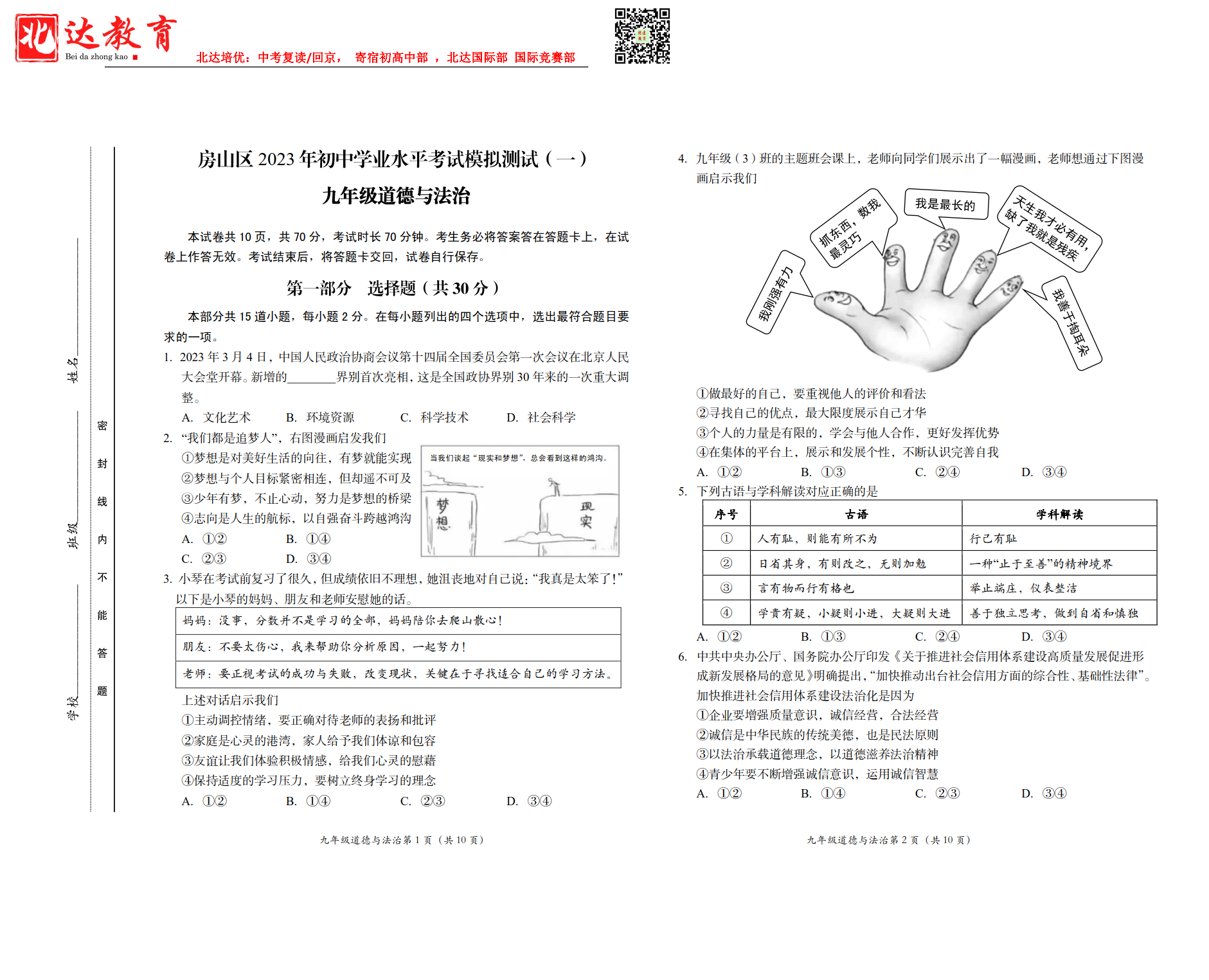 admw360中考网第一时间为大家整理了2023北京房山区初三一模道法试题及答案,分享给大家。