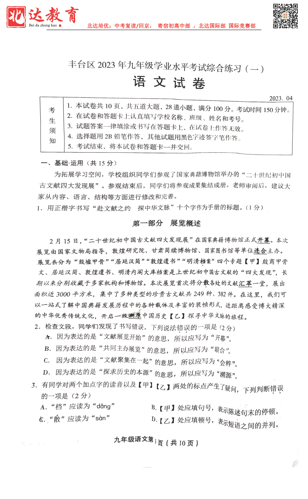 admw360中考网第一时间为大家整理了2023北京丰台区初三一模语文试题及答案,分享给大家。
