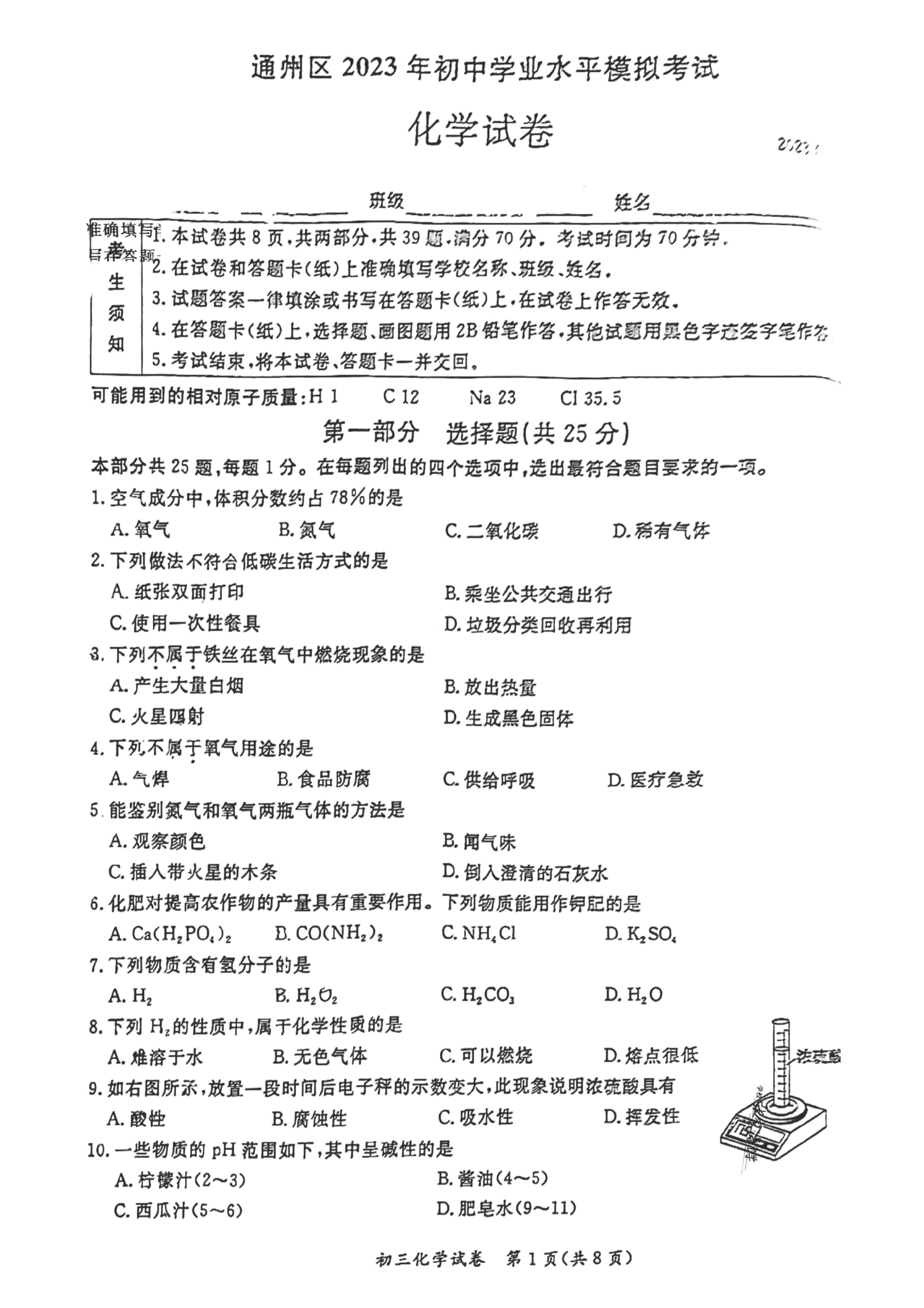 admw360中考网为大家整理了2023北京通州区初三一模化学试题及答案,分享给大家。