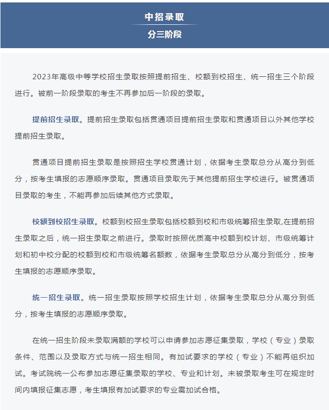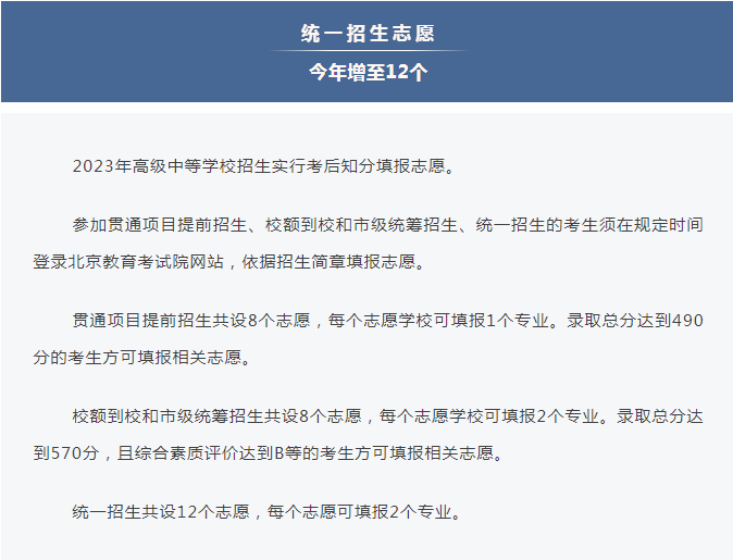 昨日,北京教育考试院发布《关于做好2023年高级中等学校考试招生工作的通知》,2023年中招录取总分为660分,高级中等学校招生实行考后知分填报志愿,其中统一招生志愿今年增至12个,每个志愿可填报2个专业。