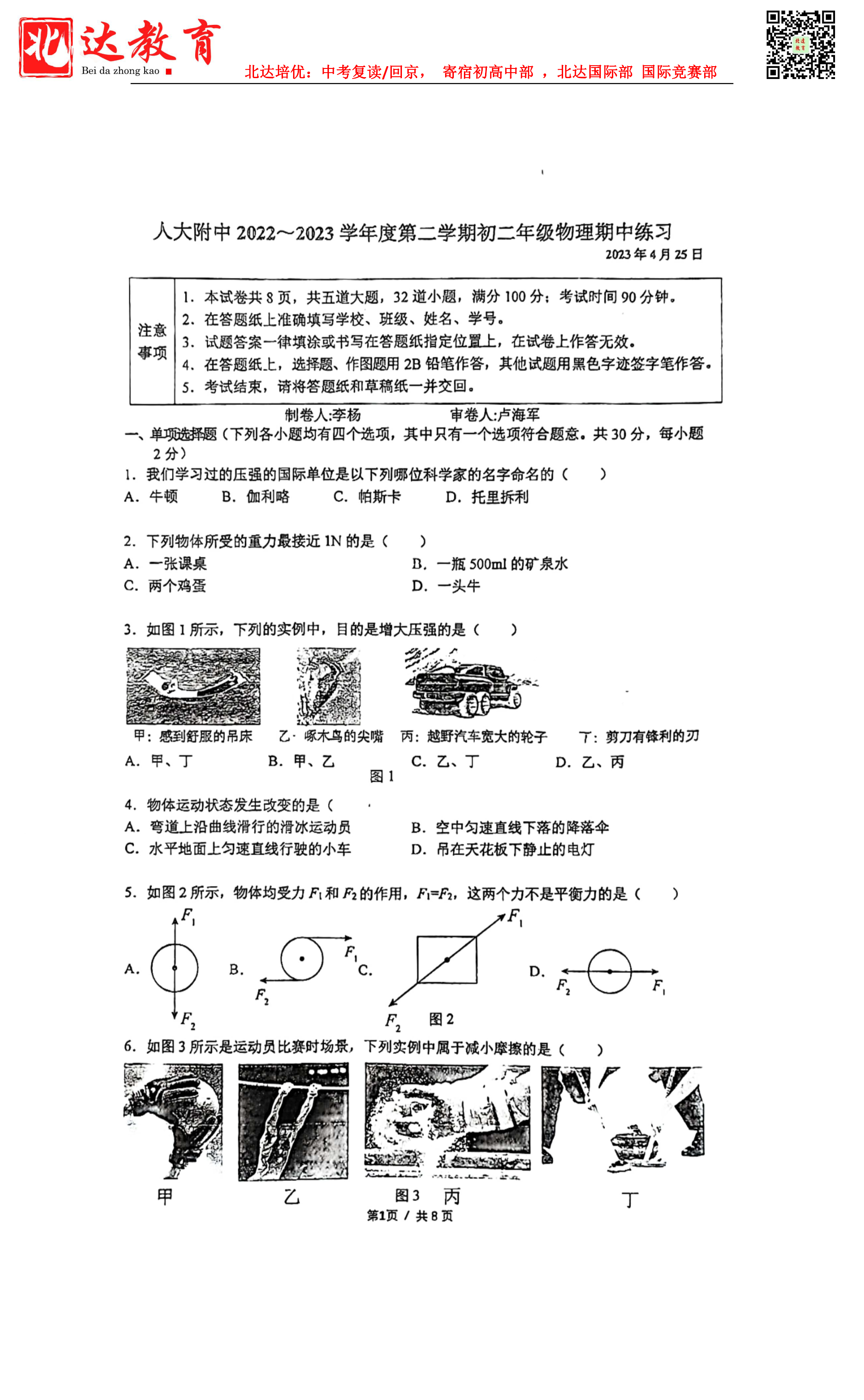 2023北京海淀人大附中初二下物理期中考已结束,admw360中考网为大家整理了 试题及答案,分享给大家。