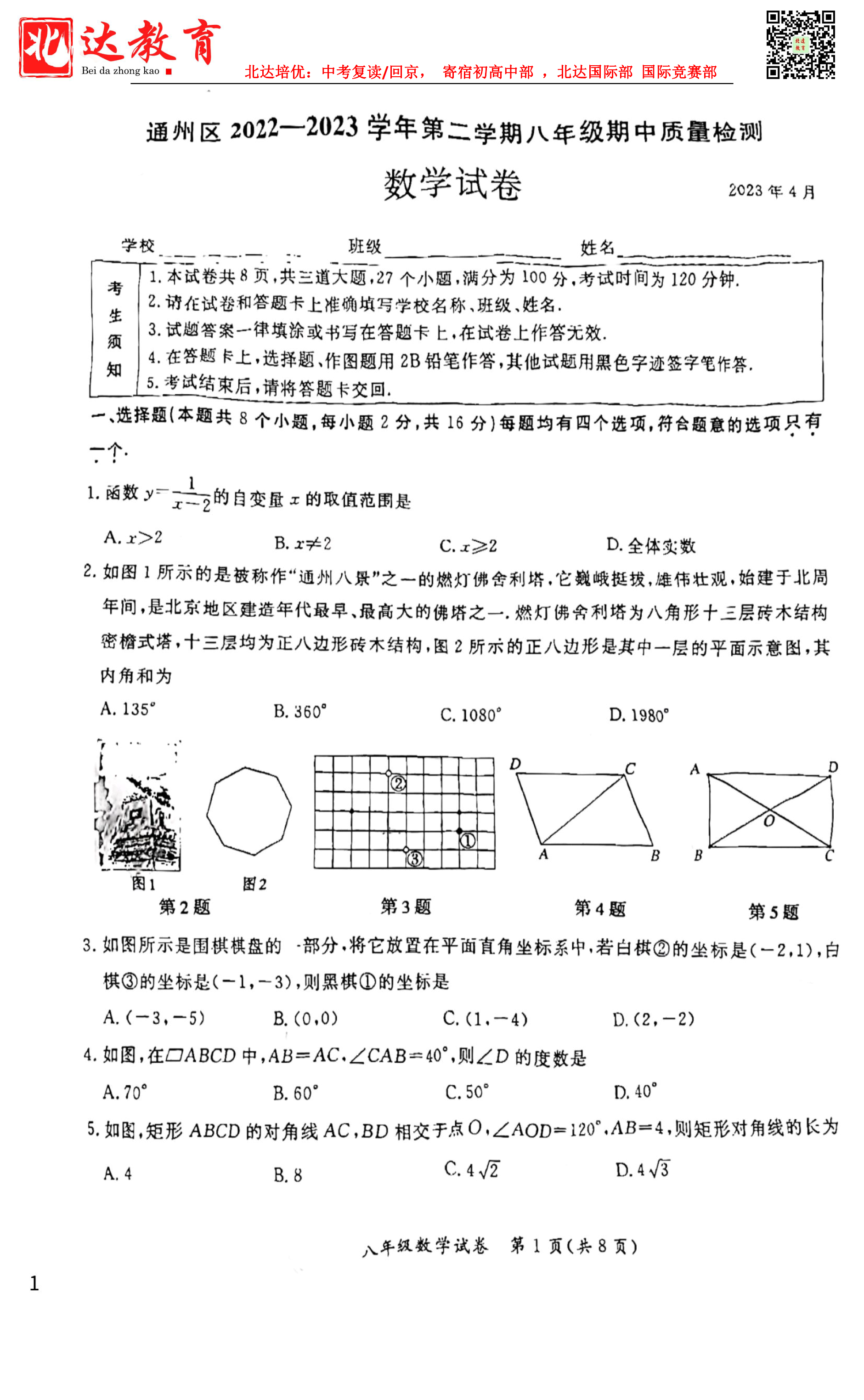 2023北京通州区初二下数学期中考已结束,admw360中考网为大家整理了 试题及答案,分享给大家。