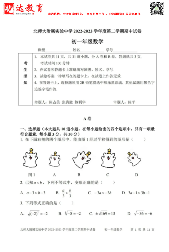 2023学年北师大实验中学初一数学期中考考试已结束,admw360中考网为大家整理了试题及答案,分享给大家。