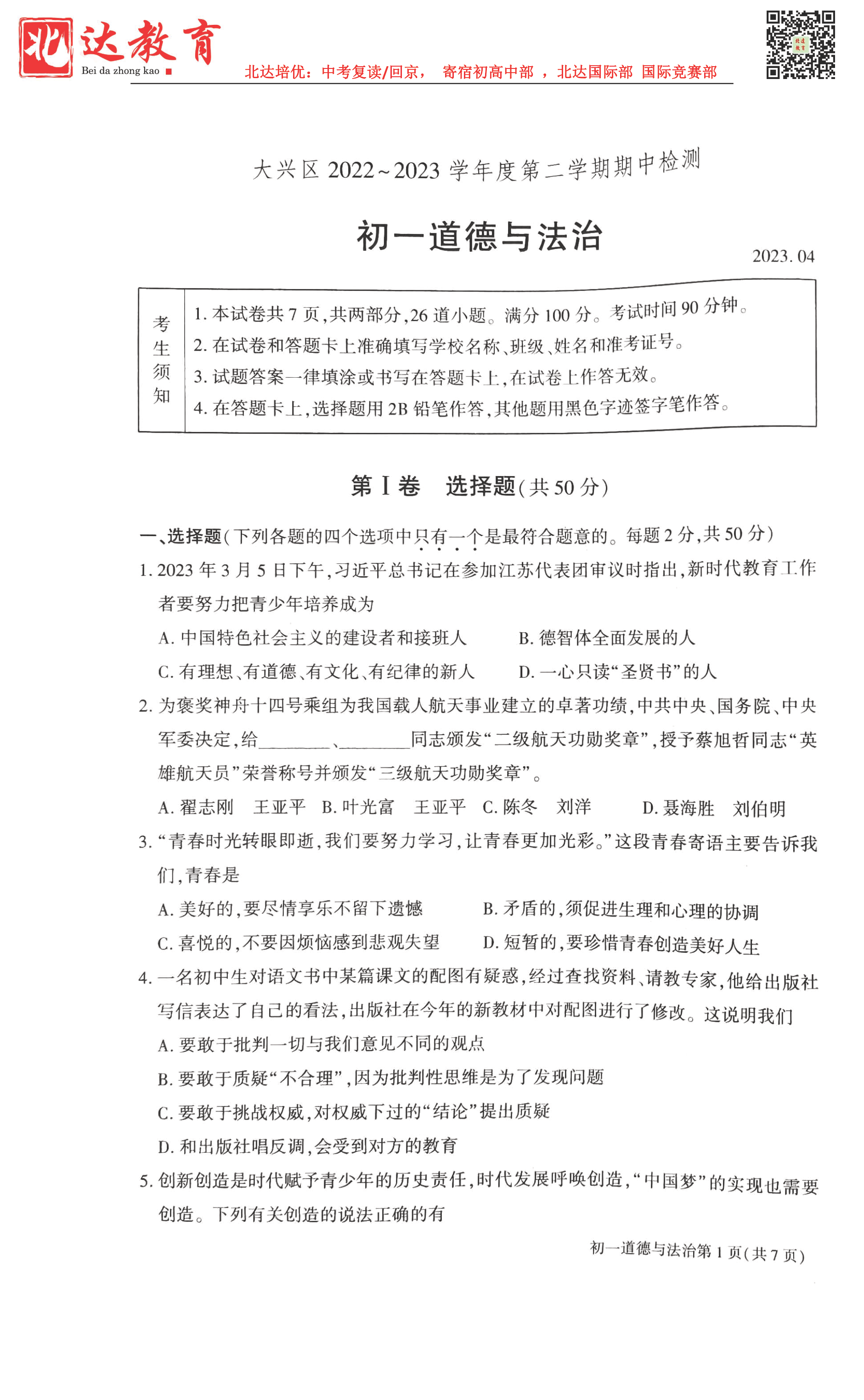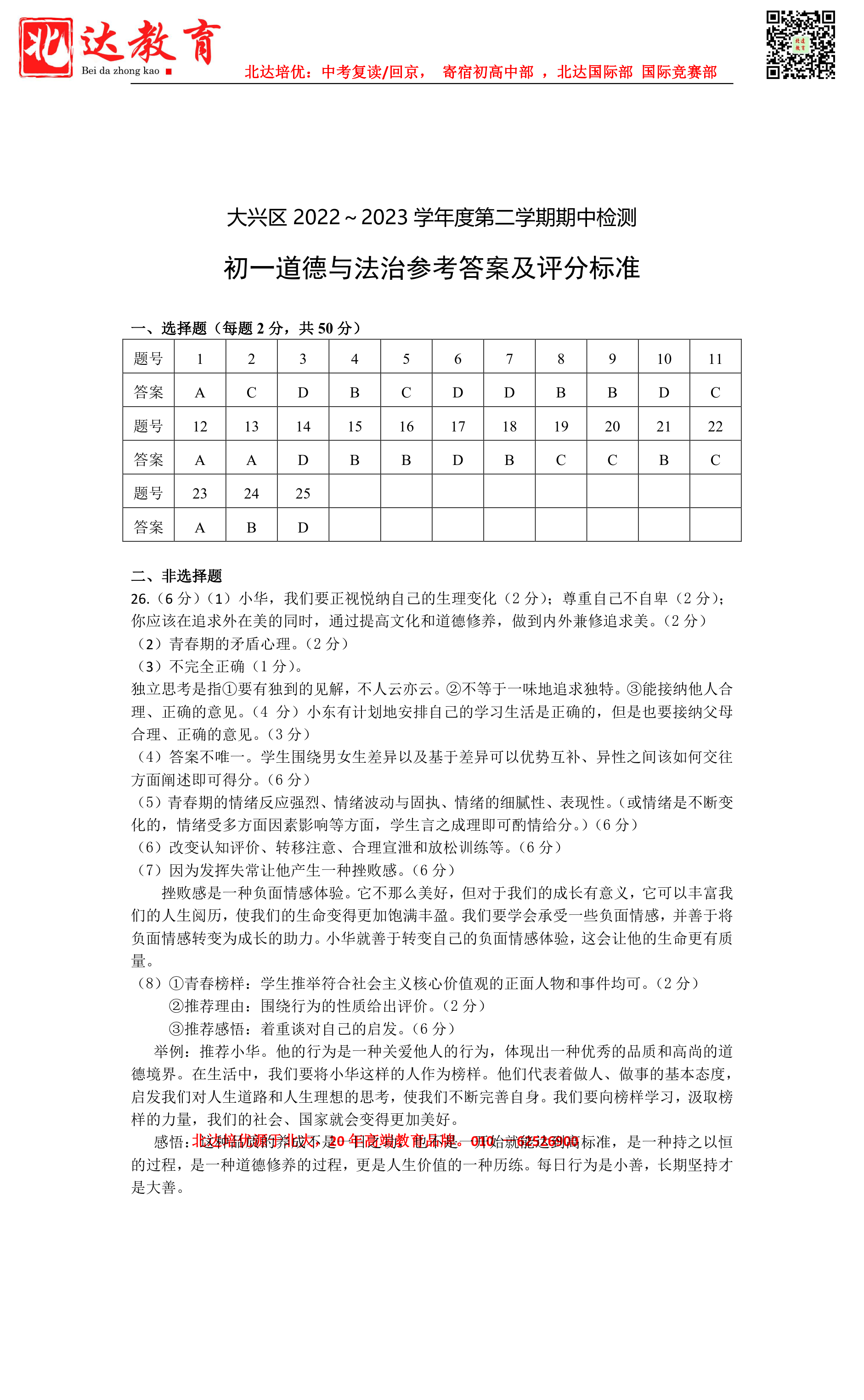 2023学年大兴初一道法期中考考试已结束,admw360中考网为大家整理了试题及答案,分享给大家。