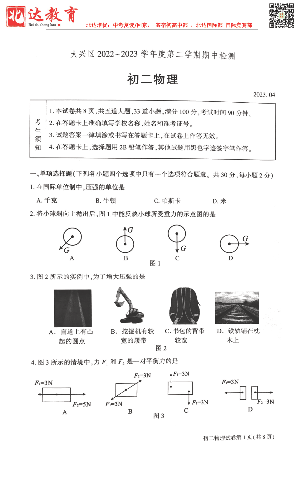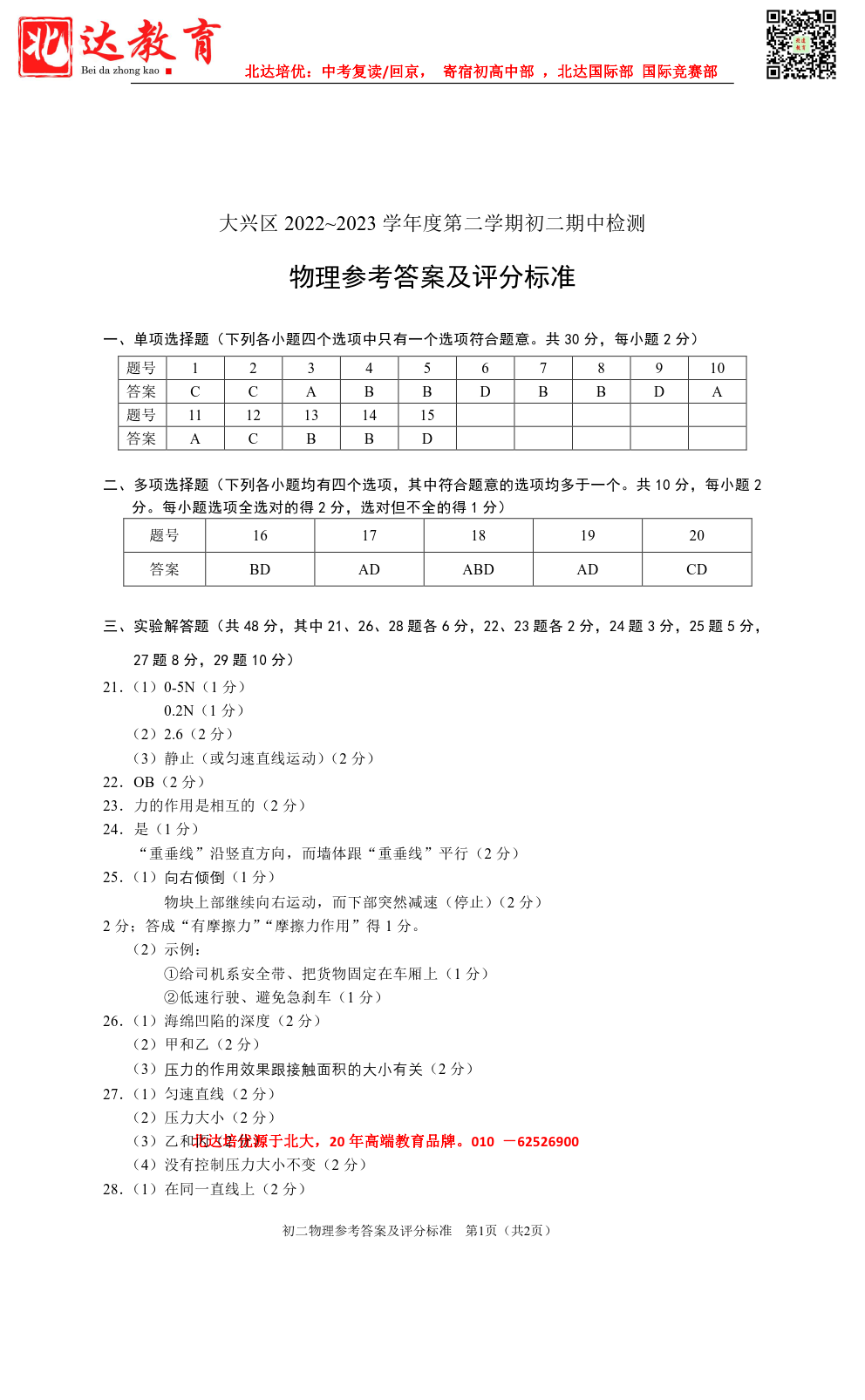 2023北京大兴区初二下物理期中考已结束,admw360中考网为大家整理了 试题及答案,分享给大家。