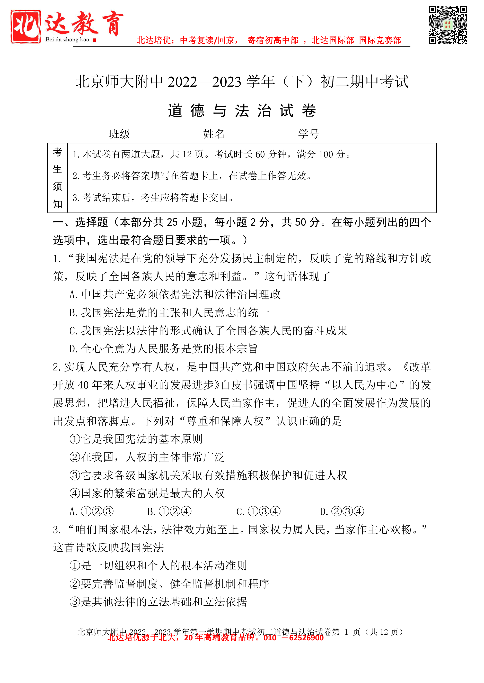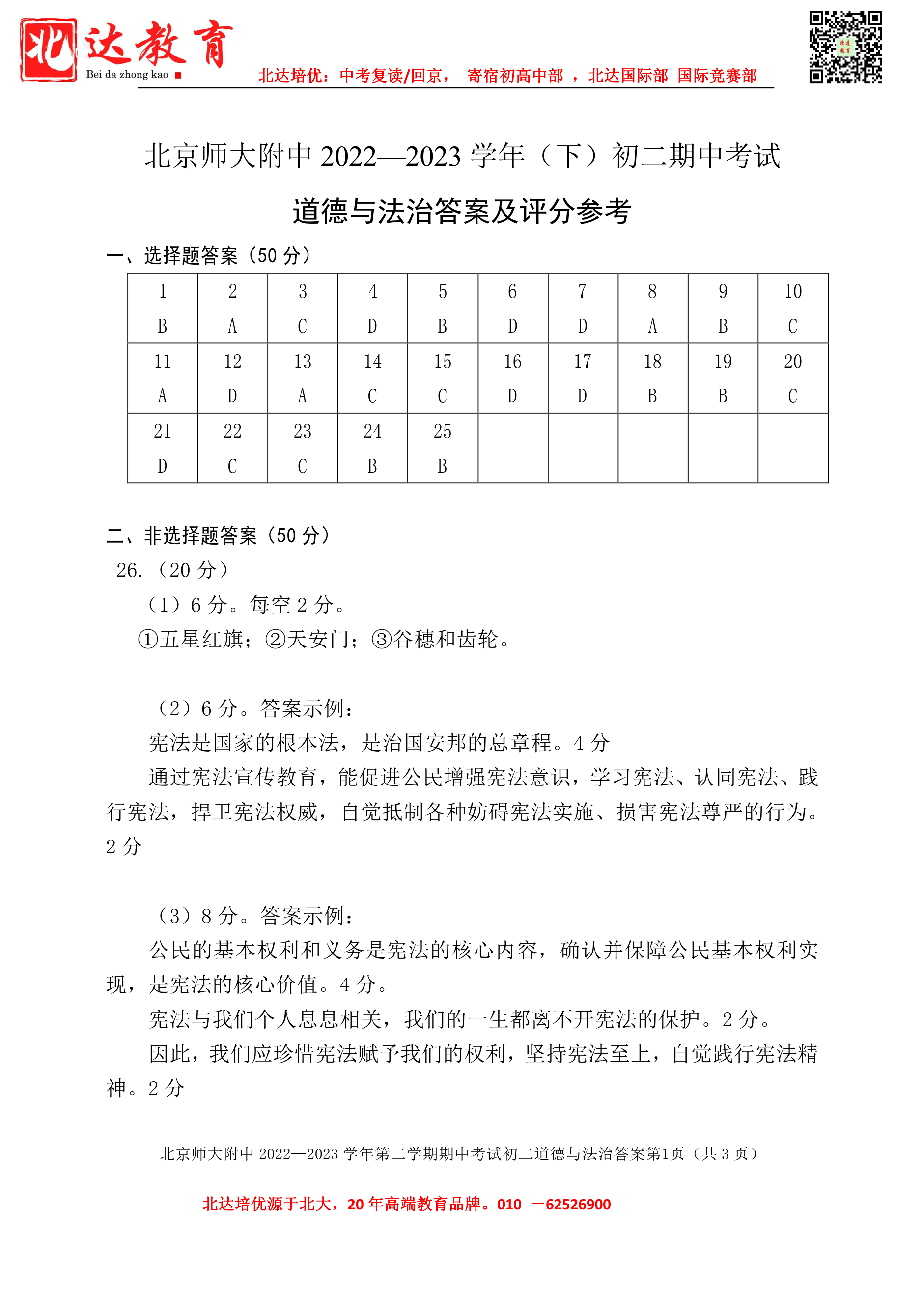 2023北京北师大附中初二下道法期中考已结束,admw360中考网为大家整理了 试题及答案,分享给大家。