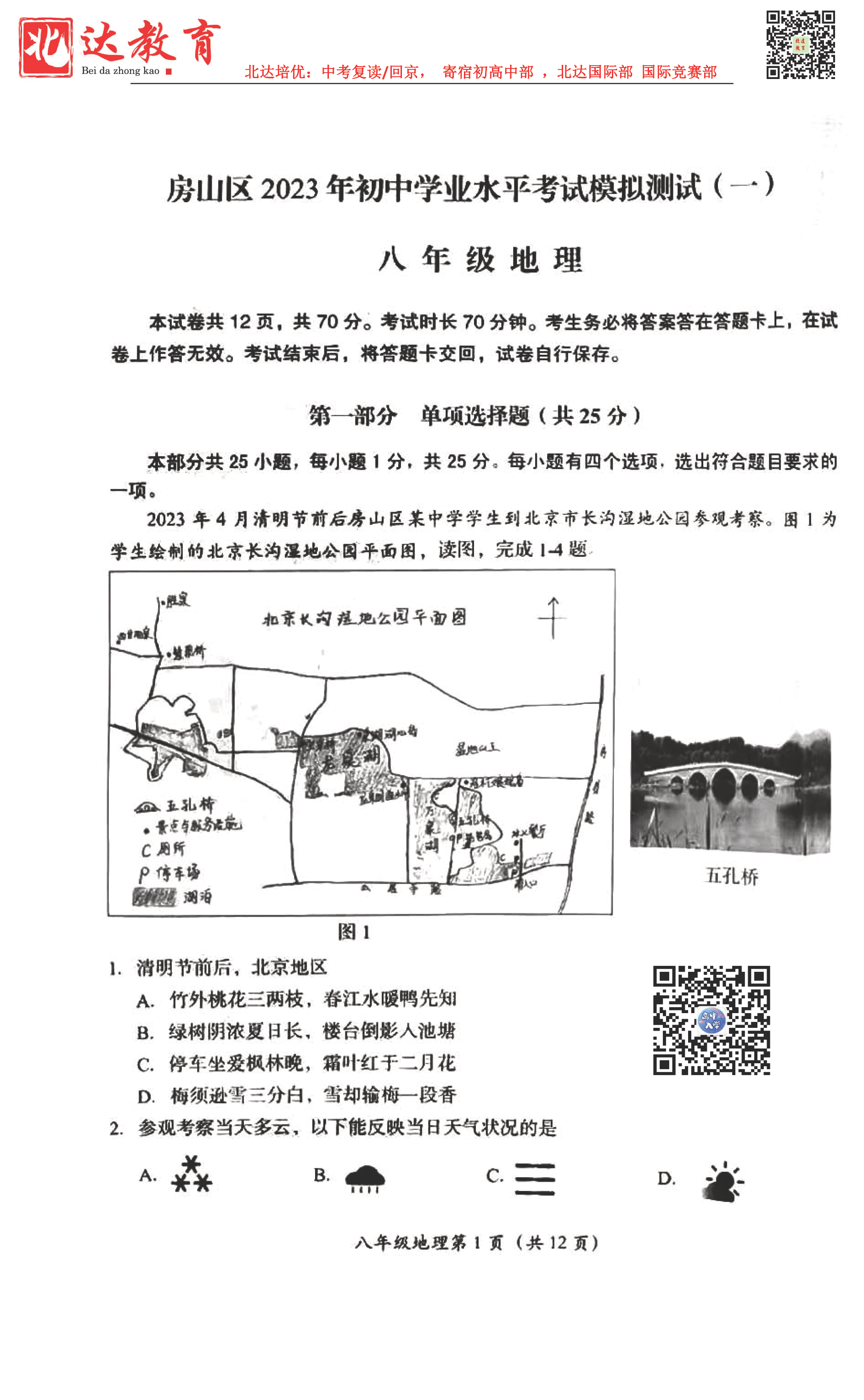 2023北京房山区初二下地理期中考已结束,admw360中考网为大家整理了 试题及答案,分享给大家。